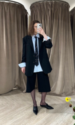 Удлиненные бермуды со стрелками из костюмной ткани - прекрасный вариант разнообразить осенне-зимний гардероб. У изделия есть диагональные карманы и аккуратные защипы по линии талии, которые играют в пользу любой фигуры. Застегивается на пуговицу, молнию и крючок. В пару можно выбрать однобортный жакет из такой же ткани.