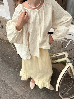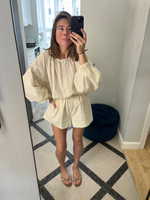 Объемная блуза красивой формы с легкой драпировкой вдоль круглой горловины и широкими рукавами, собранными на резинку по нижнему краю. Выполнена из фактурного ажурного хлопка, который хорошо держит форму. Застегивается на пуговицы в цвет изделия. В пару можно выбрать шорты из такой же ткани.