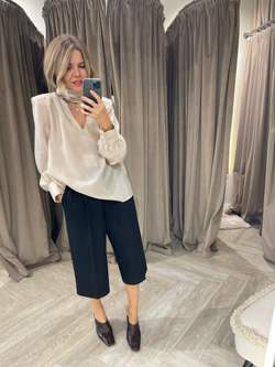 Блуза свободного кроя с V-образным вырезом с галстуком-бантом и подплечниками - наша современная интерпретация ретро-эстетики. Выполнена из тенсела с добавлением шерсти и полиэстера. Ткань имеет деликатную полупрозрачность и минимально сминается. Галстуком-бантом можно регулировать настроение в образе - завязывать по разному или оставить не завязанным, добавляя в образ красивой небрежности.