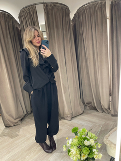 Блуза свободного кроя с воротником-воланом и широкими манжетами. Выполнена из тенсела средней плотности с добавлением шерсти, застегивается на пуговицы в цвет изделия. Настроение блузы можно варьировать способом носки: можно застегнуть пуговицы полностью и получить более собранный образ или оставить несколько верхних пуговиц расстегнутыми и добавить в образ небрежного шика.