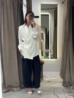 Пижамная блуза с подплечниками, на запах. Изделие свободного кроя из фактурного полиэстера. Шалевый воротник и манжеты на пуговицах — правильные акценты, придающие богемный шик. Блуза фиксируется внутри потайными завязками, снаружи также есть завязки, с помощью которых можно регулировать степень свободы изделия. В пару можно выбрать брюки из такой же ткани.
