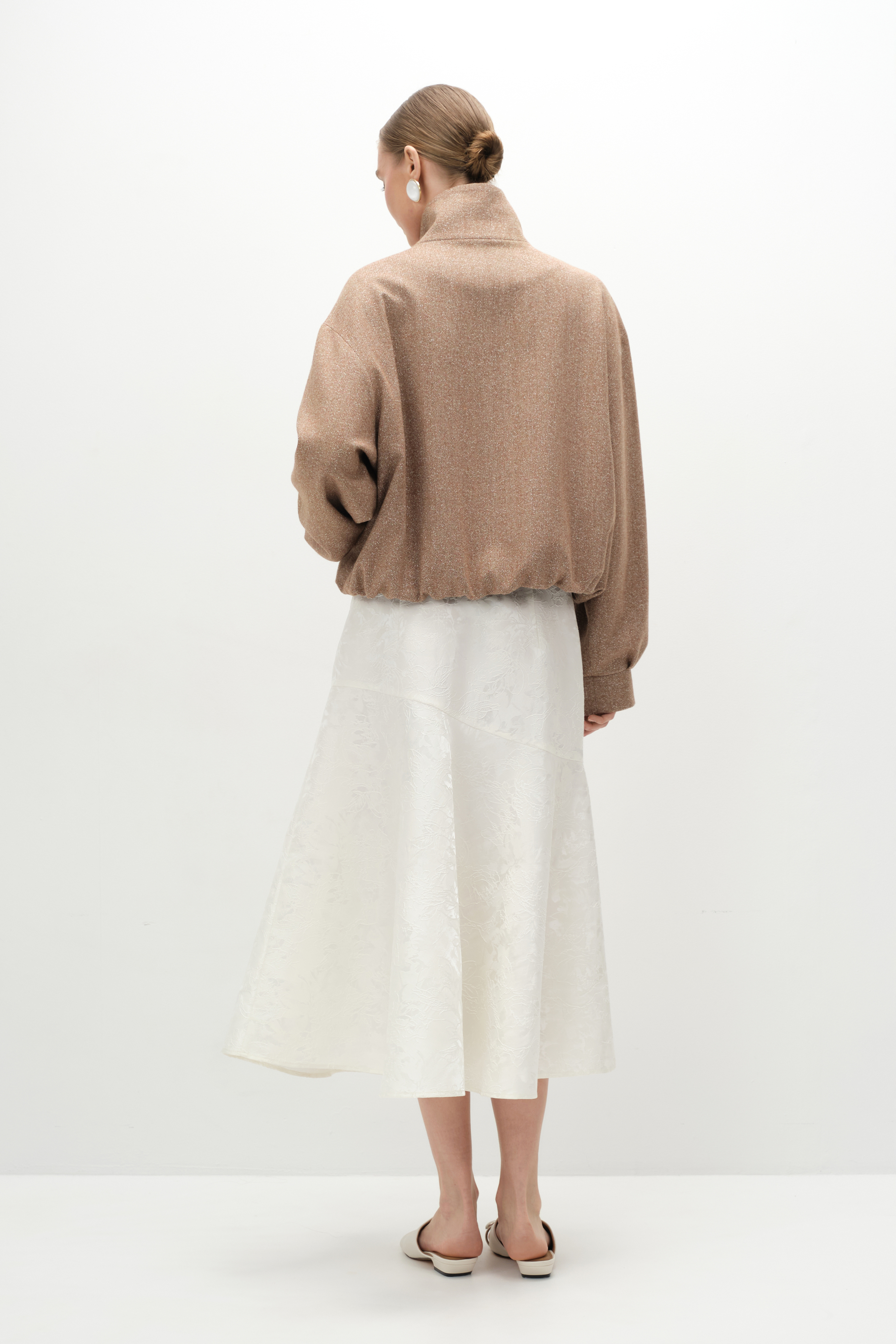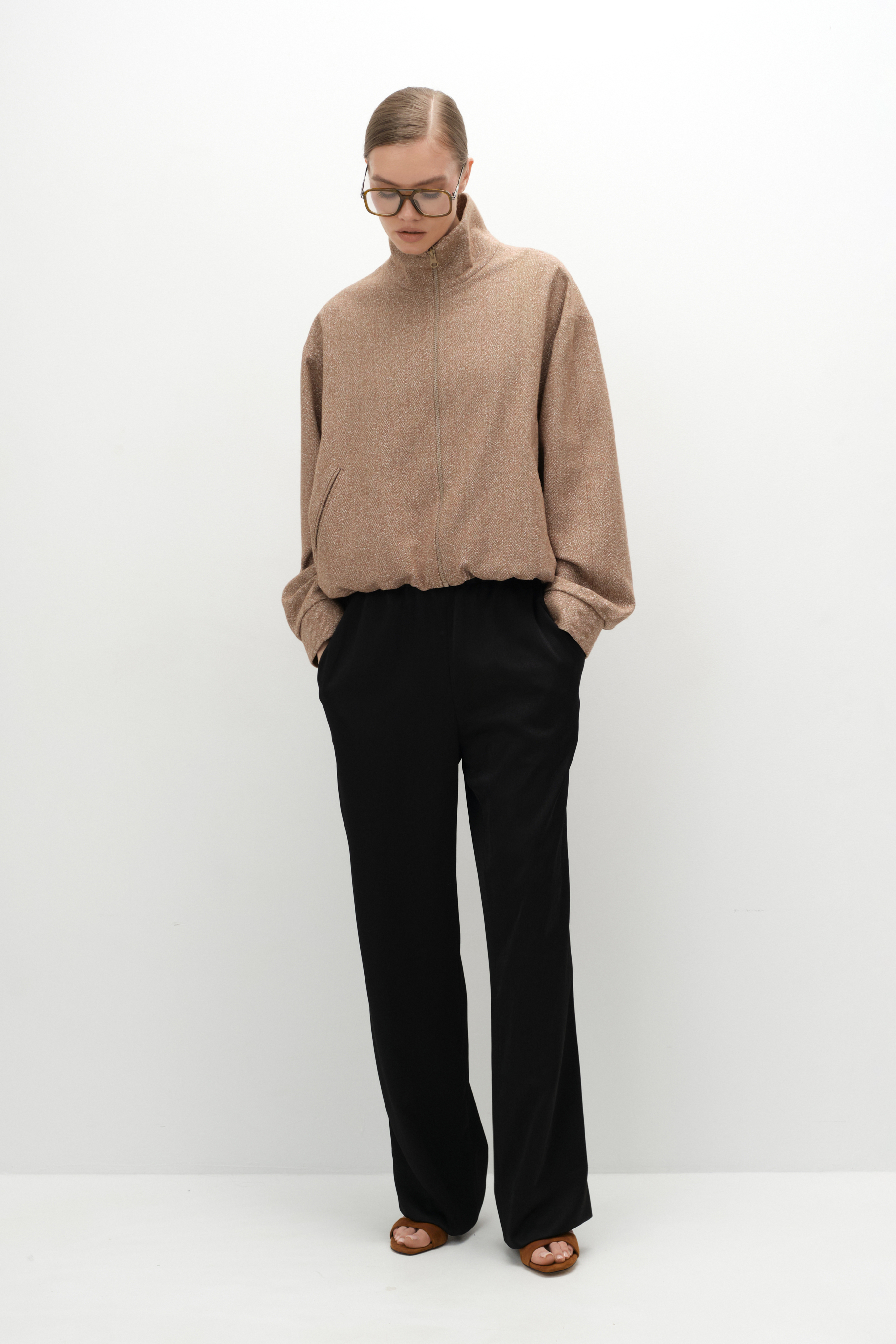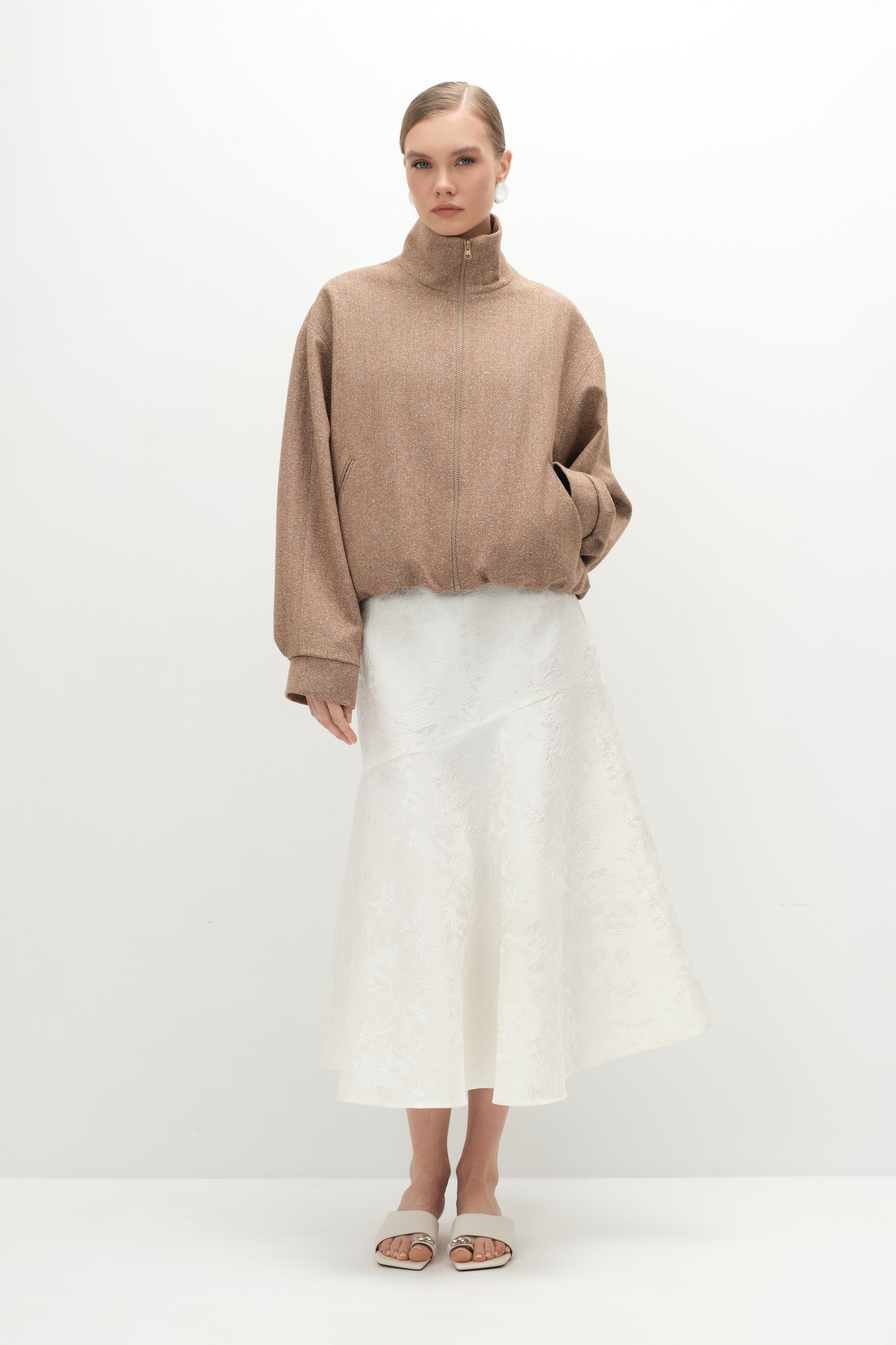 Куртка-бомбер выполнена из смесовой фактурной шерсти, на подкладе из поливискозы, застегивается на молнию в цвет изделия. Модель свободного кроя со спущенной линией плеч и широкими манжетами. Рекомендуемый температурный режим от +5 градусов и выше (зависит от личных ощущений).