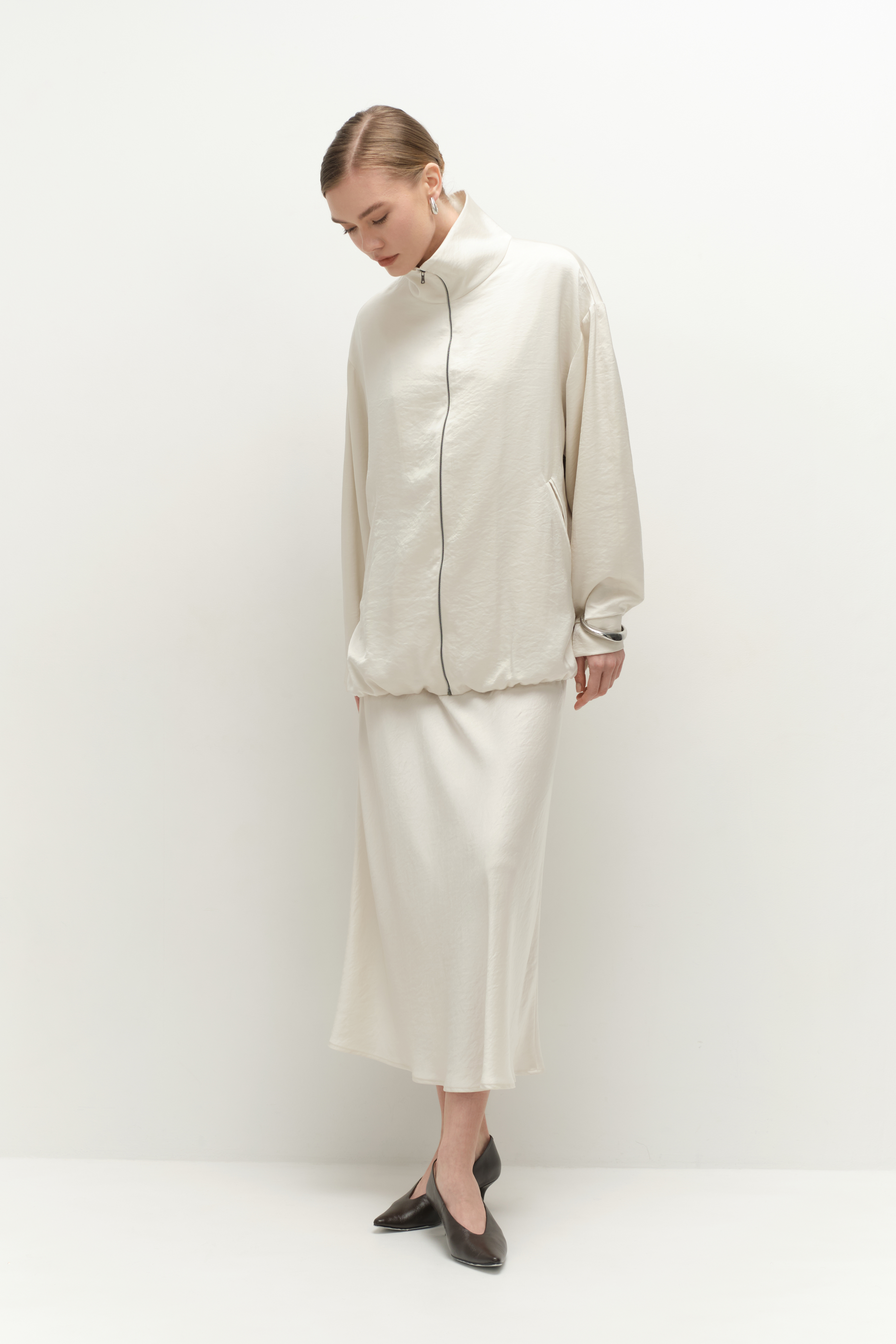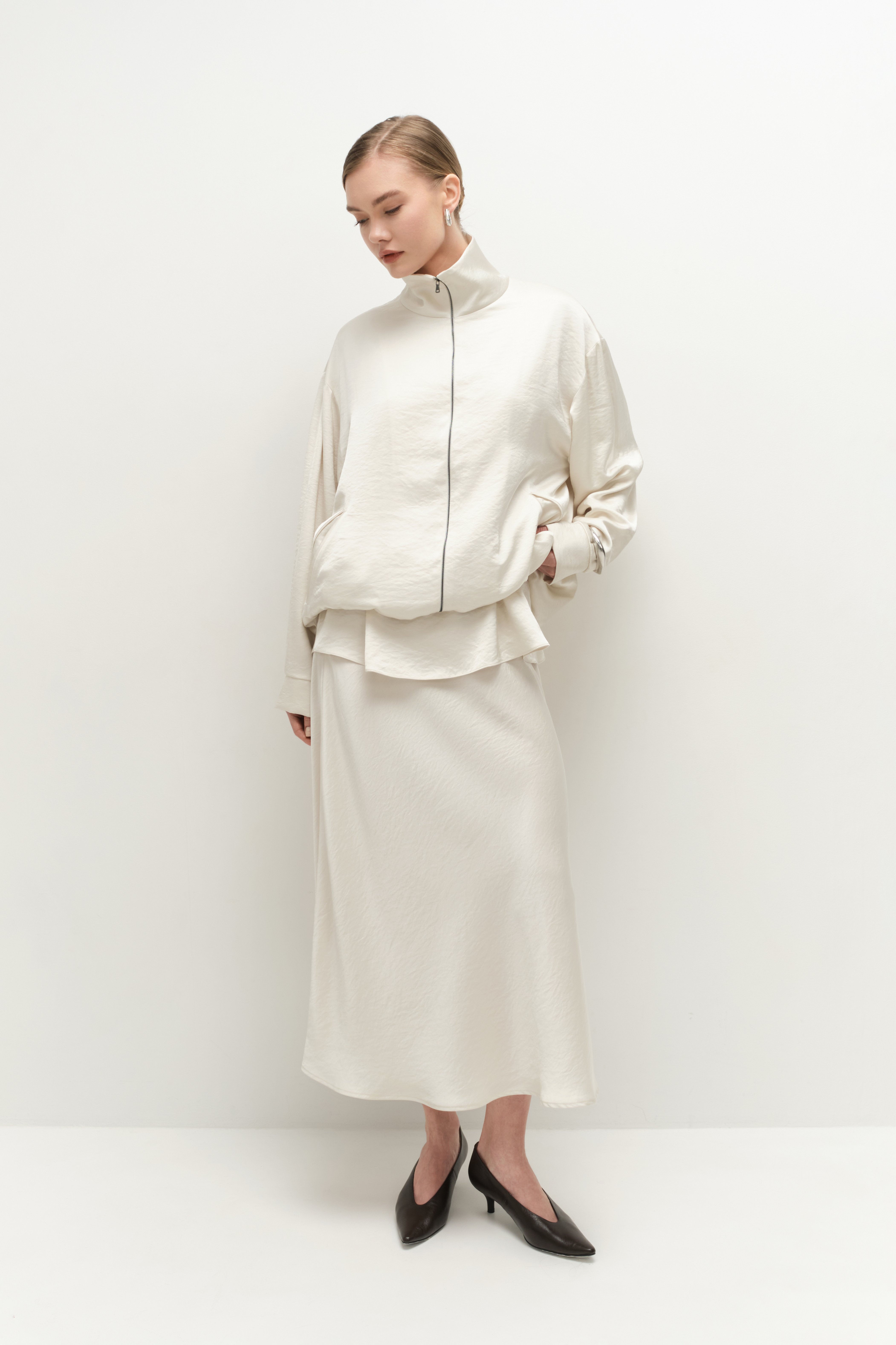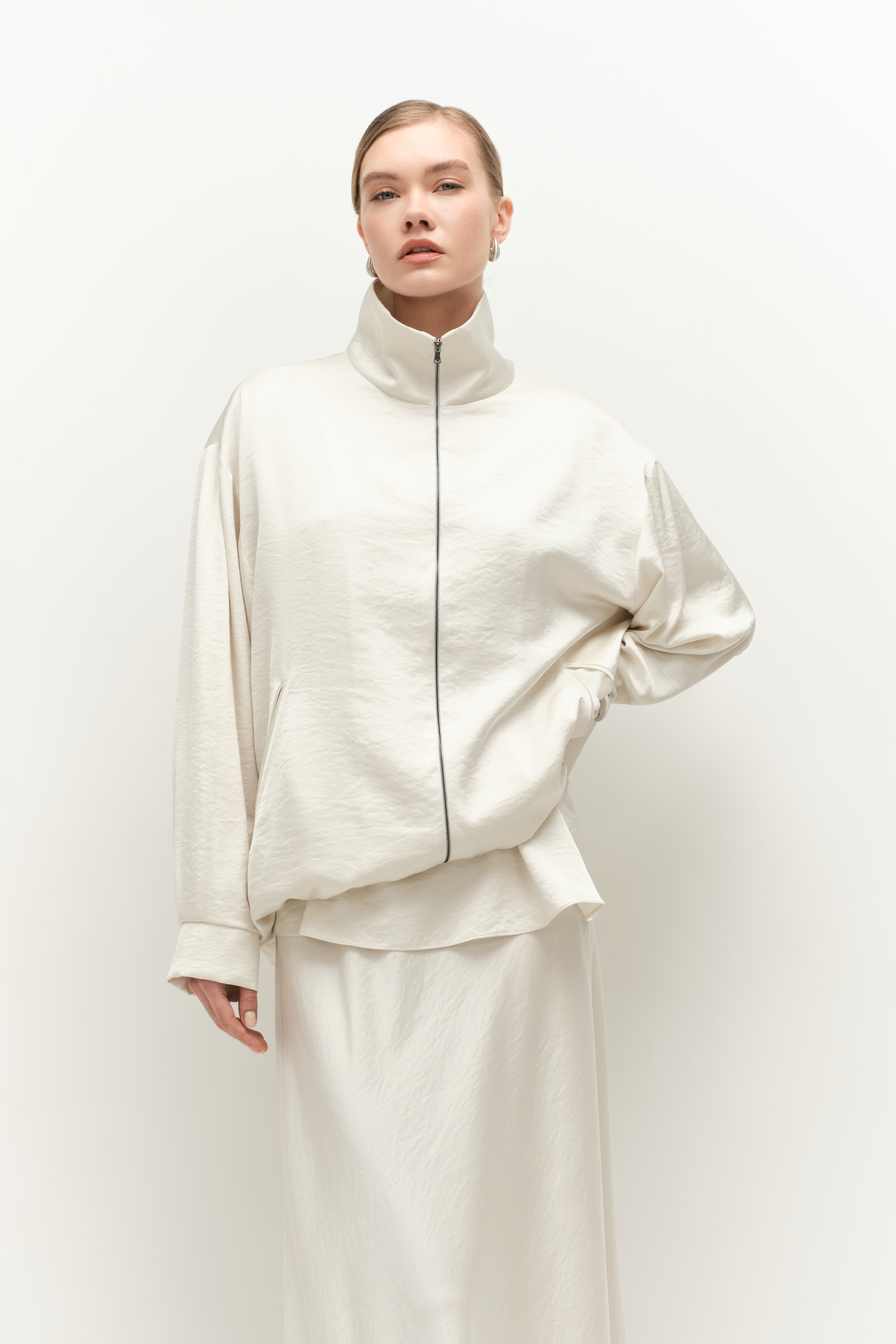 Жемчужный бомбер на молнии с легким струящимся эффектом. Умеренного объема, с воротником-стойкой, манжетами и потайной резинкой по низу для удобства. Идеальный вариант для повседневной носки или в качестве легкой верхней одежды. Изготовлен из пластичной поливискозы на подкладке. Для завершения образа рекомендуем сочетать с юбкой и топом из той же ткани.