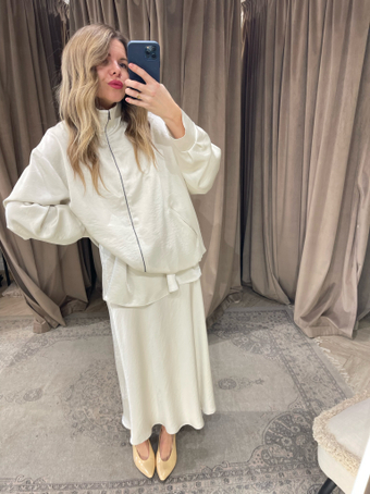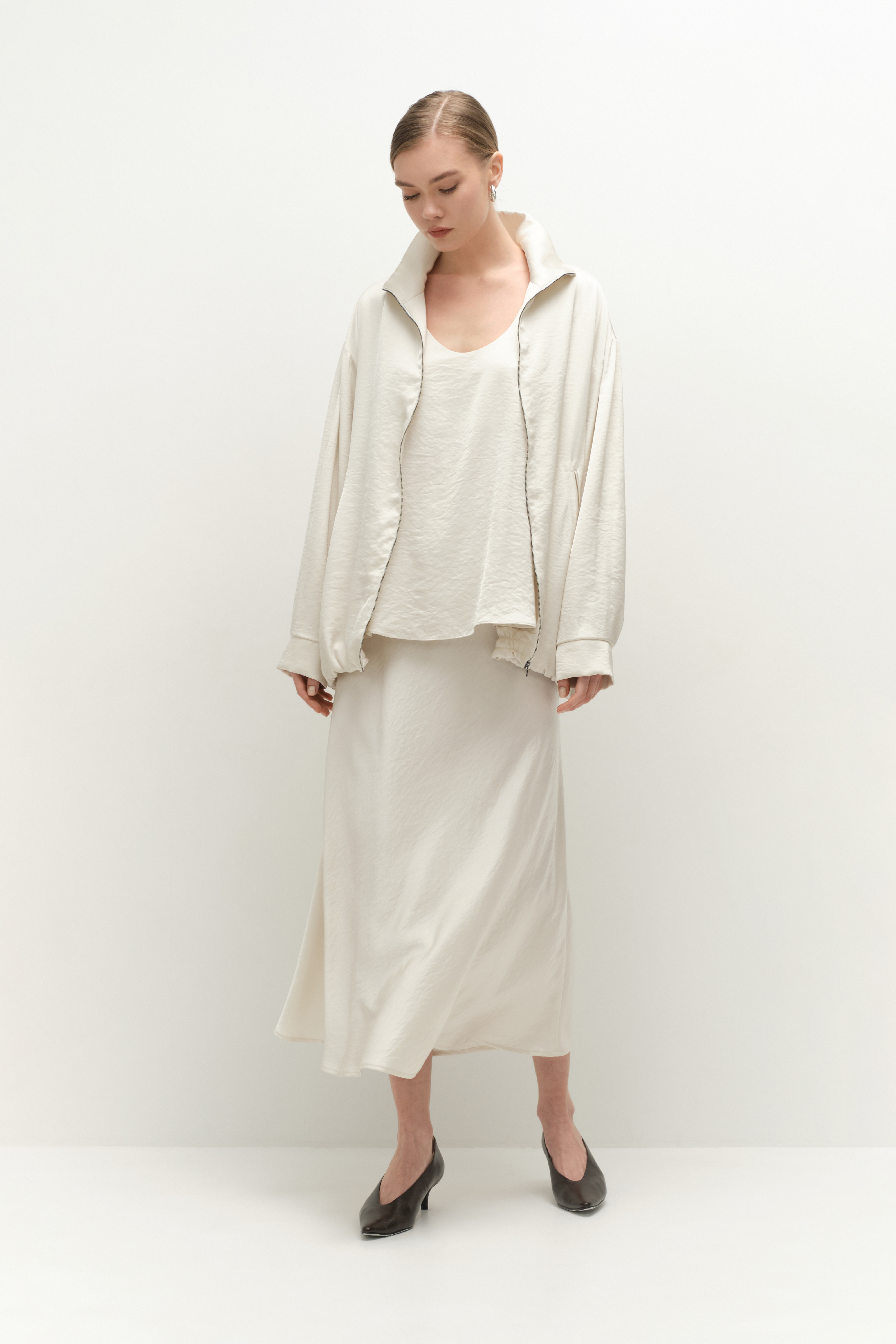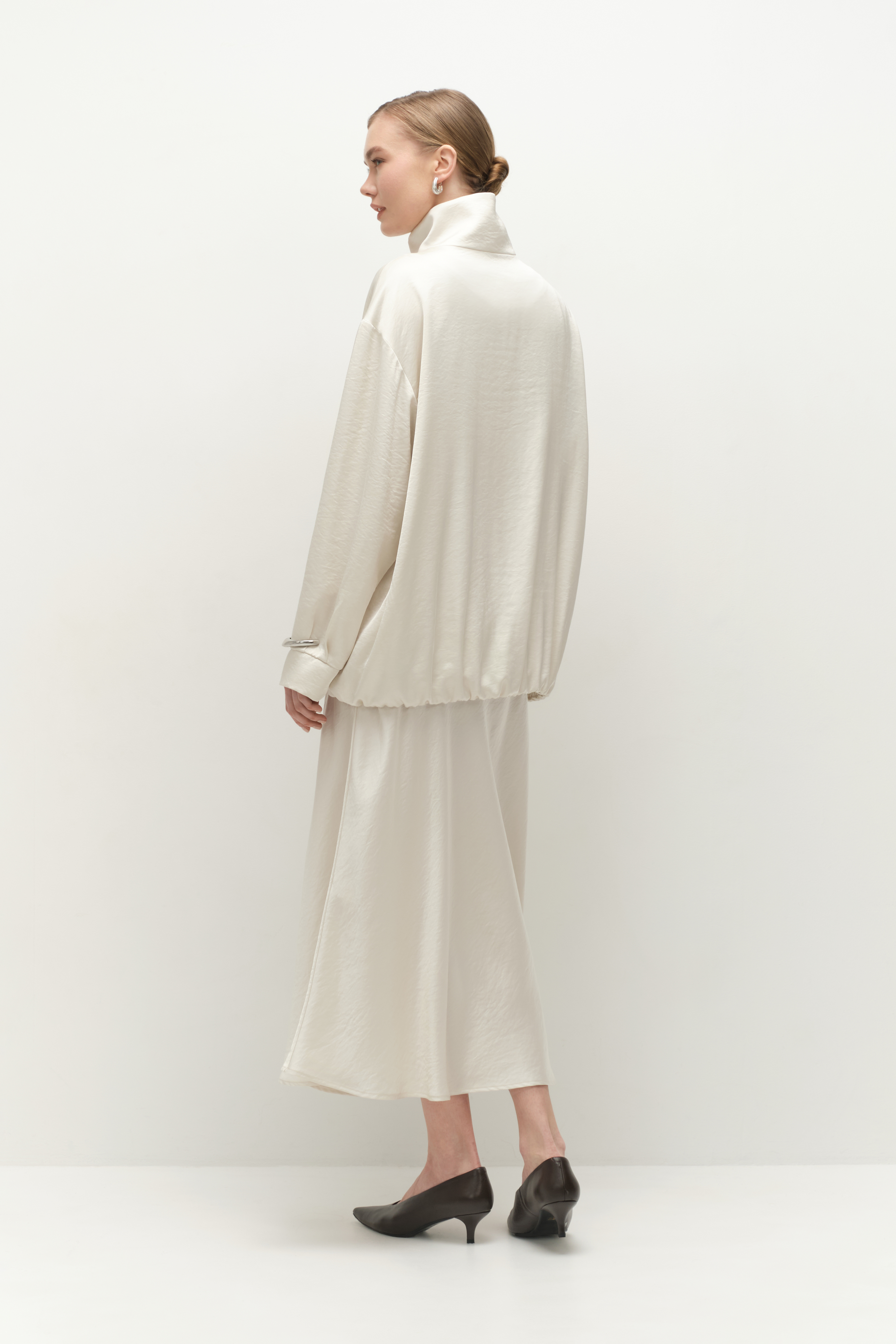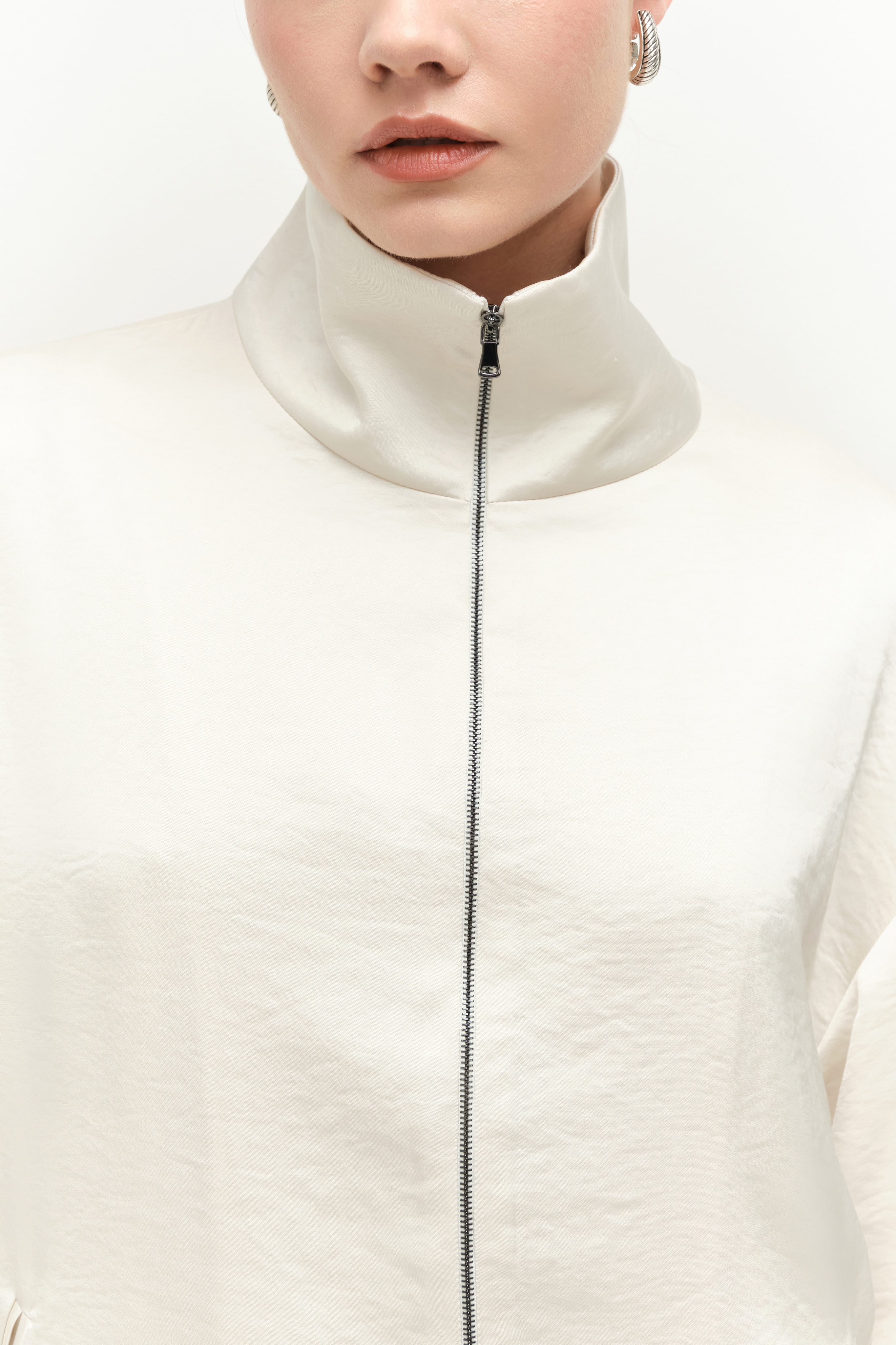 Жемчужный бомбер на молнии с легким струящимся эффектом. Умеренного объема, с воротником-стойкой, манжетами и потайной резинкой по низу для удобства. Идеальный вариант для повседневной носки или в качестве легкой верхней одежды. Изготовлен из пластичной поливискозы на подкладке. Для завершения образа рекомендуем сочетать с юбкой и топом из той же ткани.