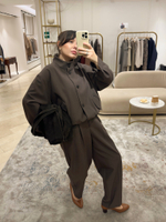Брюки-бананы со стрелками и аккуратными вертикальными защипами, которые визуально вытягивают силуэт. Выполнены из пластичной поливискозы, с посадкой на талии, застегиваются на пуговицу, крючок и молнию, имеют диагональные карманы. В пару можно выбрать жакет-бомбер из такой же ткани.