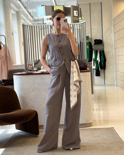 Брюки палаццо с классической посадкой на талии и диагональными карманами. Выполнены из смесового льна с добавлением тенсела. Изделие полной длины с аккуратными защипами по линии талии, которые играют в пользу любой фигуры. Брюки застегиваются на потайную пуговицу, крючок и молнию. В комплект можно выбрать удлиненный жилет из такой же ткани.