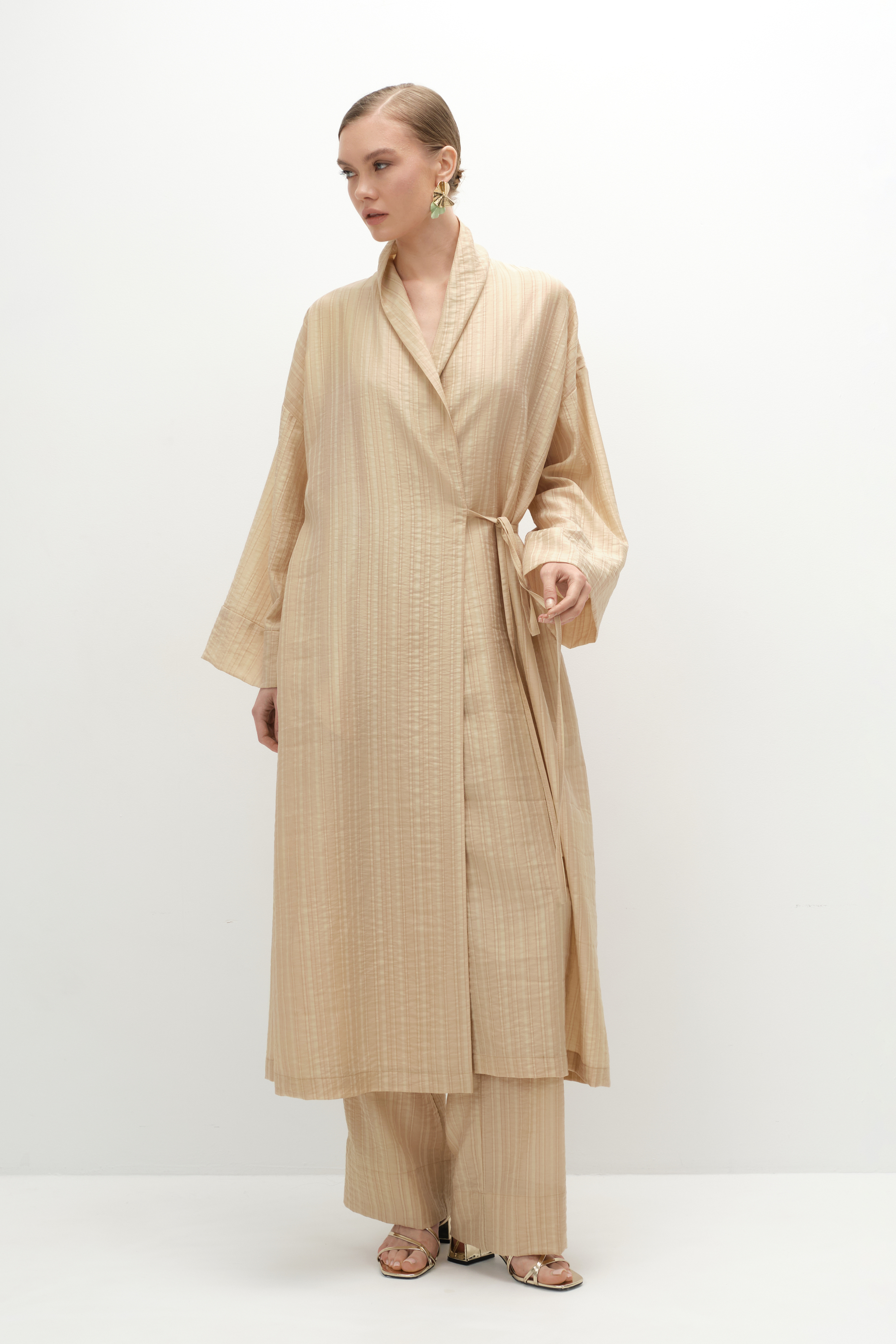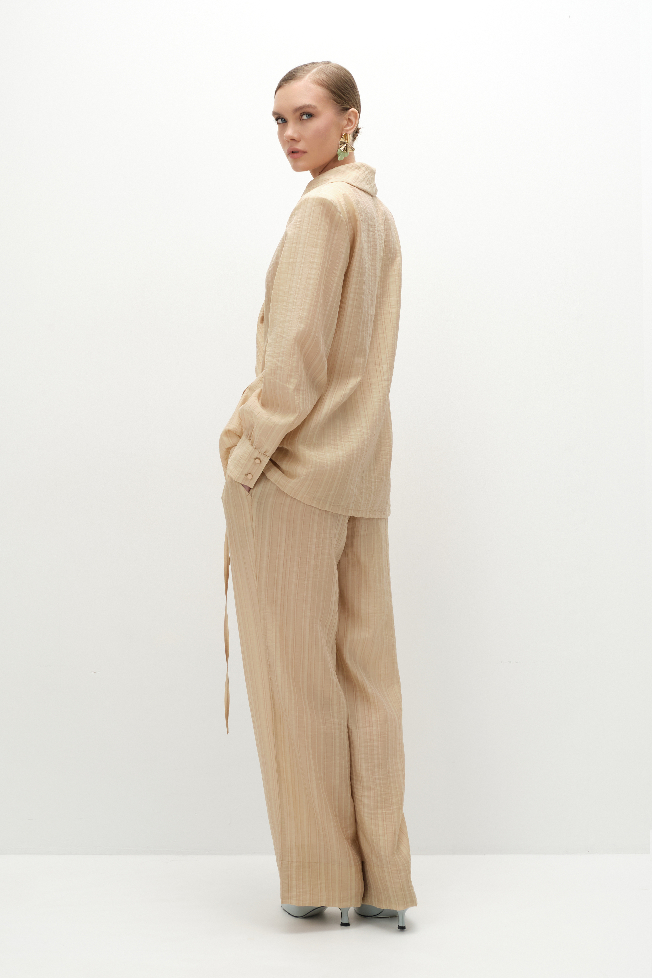Расслабленные брюки в пижамном стиле. Выполнены из тенсела в полоску, на резинке, с аккуратными диагональными карманами. В пару к ним можно подобрать блузу из той же ткани. Получится идеальный комплект как для загородного неспешного отдыха, так и для вечерних выходов — достаточно сменить обувь и аксессуары.