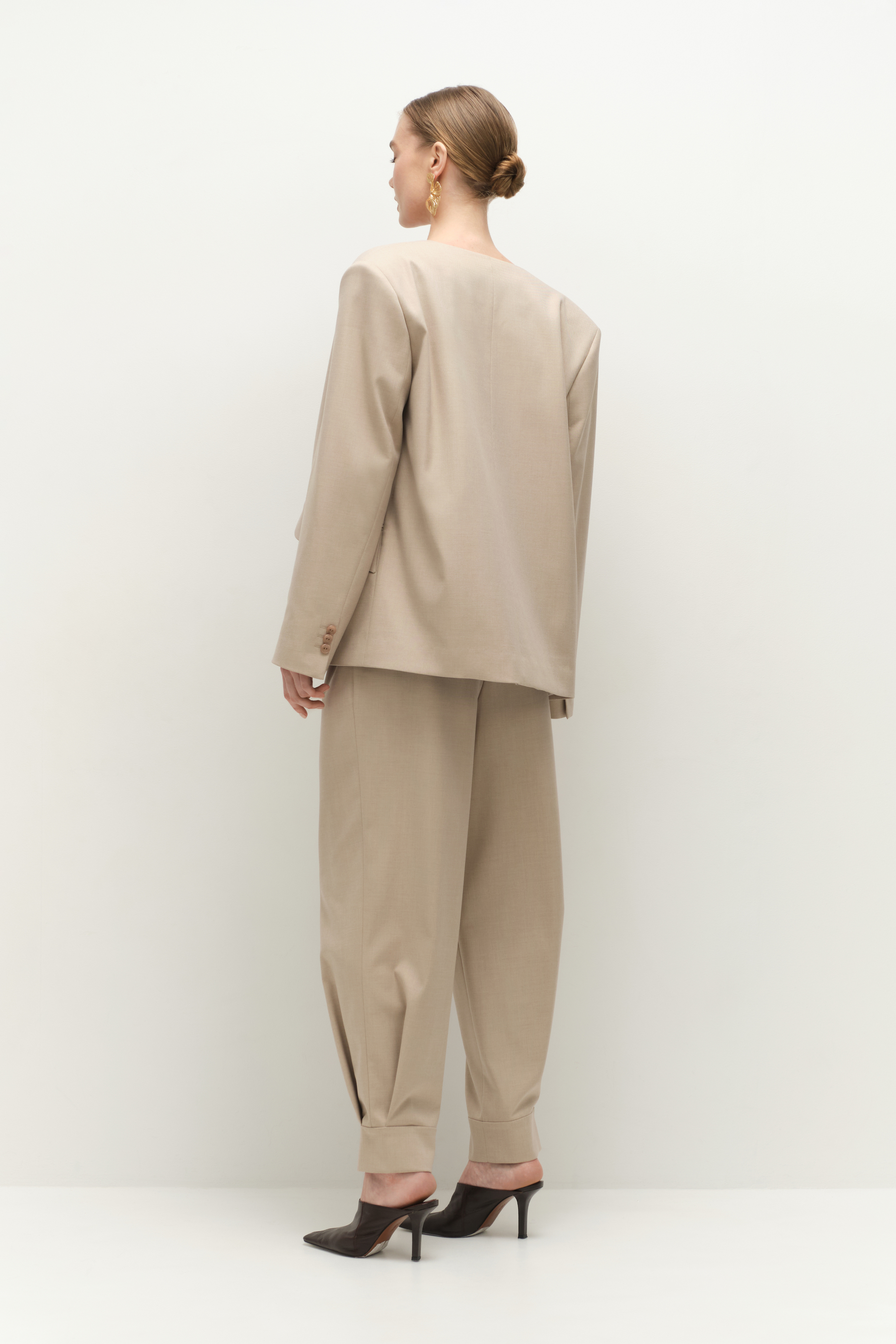Брюки с манжетами по низу выполнены в нежном бежевом оттенке. Практичная застежка на молнии и пуговице обеспечивает комфортное прилегание, а мягкая резинка по спине позволяет легко регулировать посадку, благодаря чему брюки садятся на любой тип фигуры. Тонкий подклад из поливискозы делает эти брюки приятными на ощупь и удобными в носке. Они отлично подойдут как для деловых встреч, так и для повседневных прогулок.