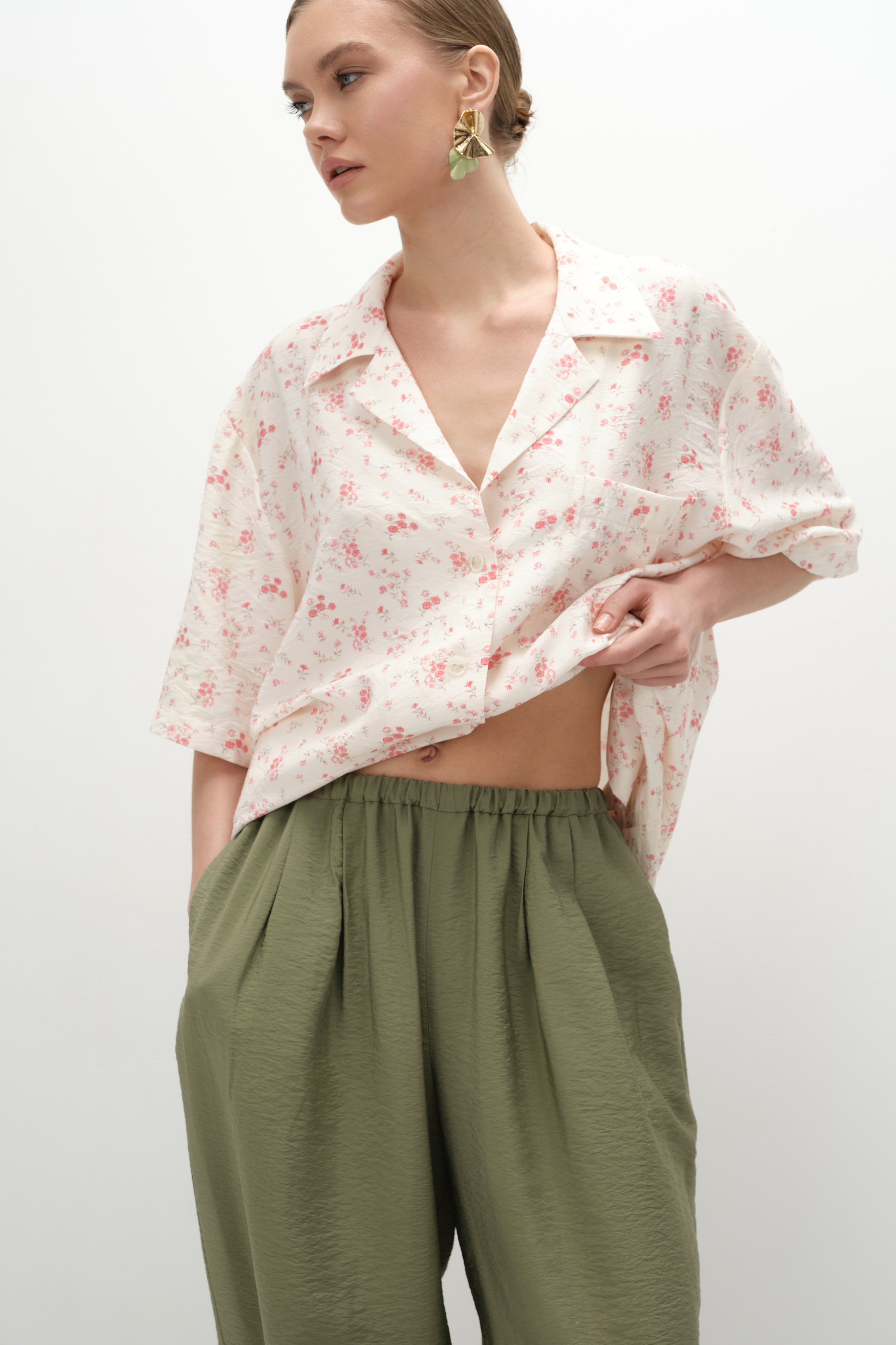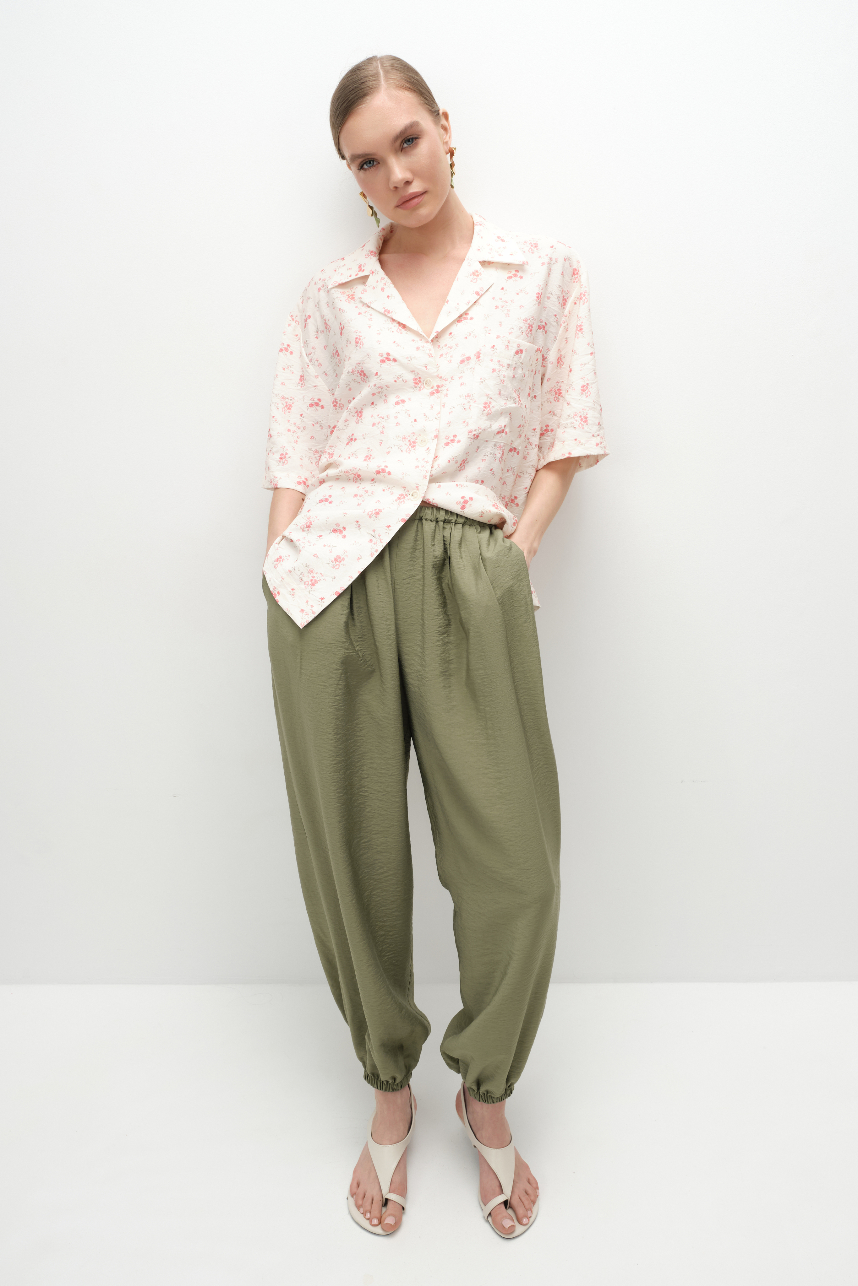 Брюки-шаровары выполнены из тонкой ткани, гладкой и приятной на ощупь. Они создадут стильный женственный образ и обеспечат комфорт как в межсезонье, так и летом. Свободный крой и эластичный пояс на резинке позволят брюкам идеально подойти к любому типу фигуры. Носите их с разными элементами из нашей капсульной коллекции или сочетайте с базовыми вещами, создавая разнообразные повседневные комплекты.