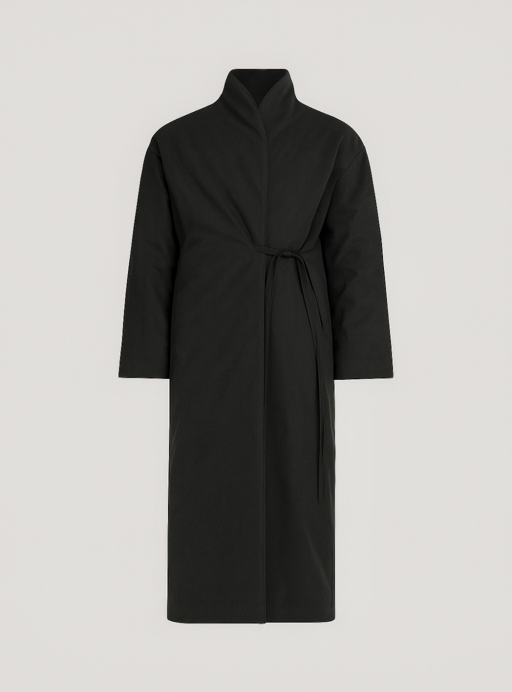 Демисезонная куртка лаконичной формы, напоминающей кимоно, в длине миди. Выполнена из мягкой матовой плотной ткани с водоотталкивающей пропиткой У изделия спущенное плечо, высокий воротник, скрытая фурнитура и завязки, которыми можно отрегулировать объем. Внутри - утеплитель ATMO Drive 150. Он обладает водоотталкивающими и теплосберегающими свойствами, при этом дышит, оставаясь мягким и эластичным при длительном использовании. Температурный режим изделия до -15 градусов (зависит от личных ощущений).