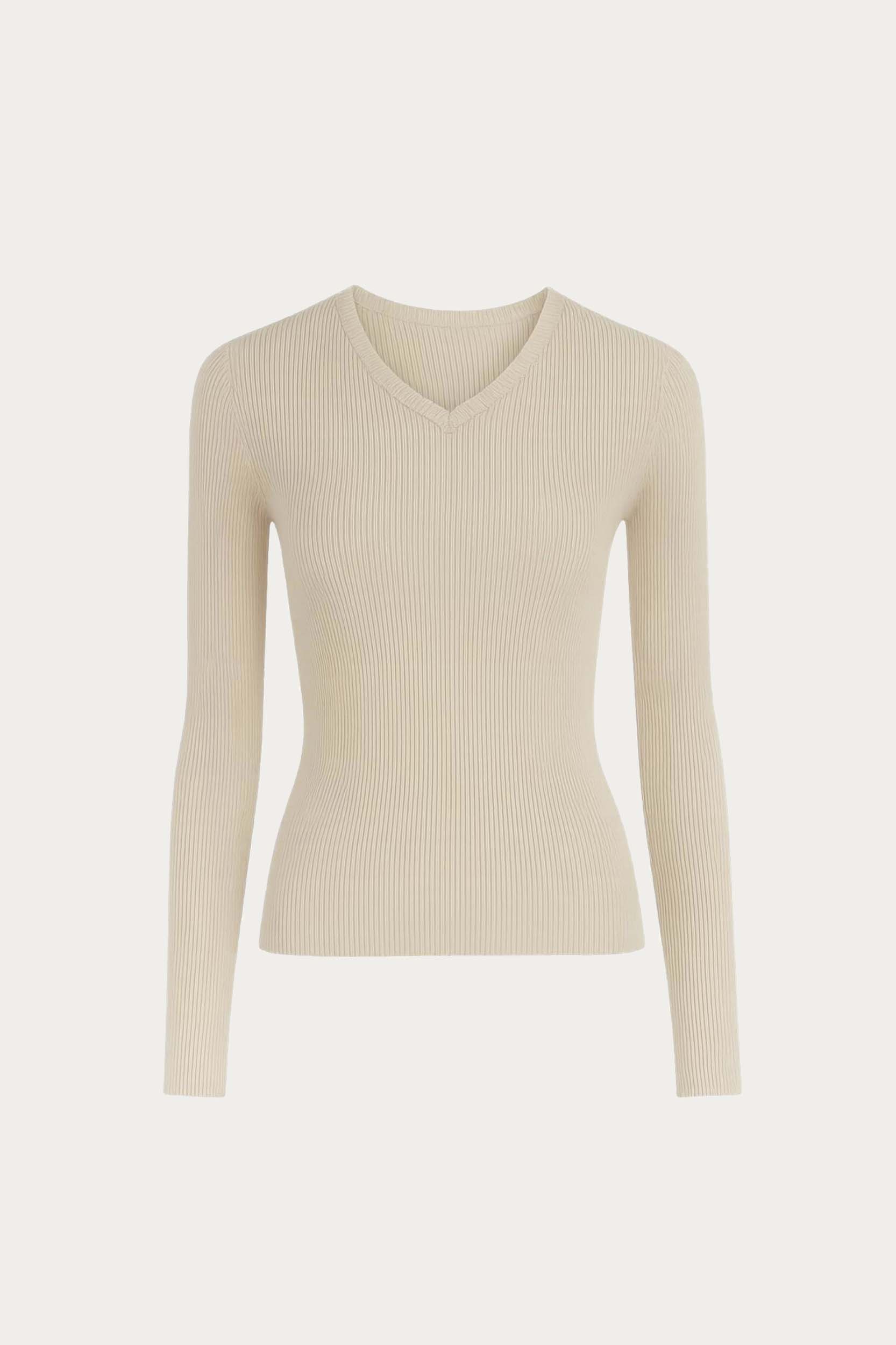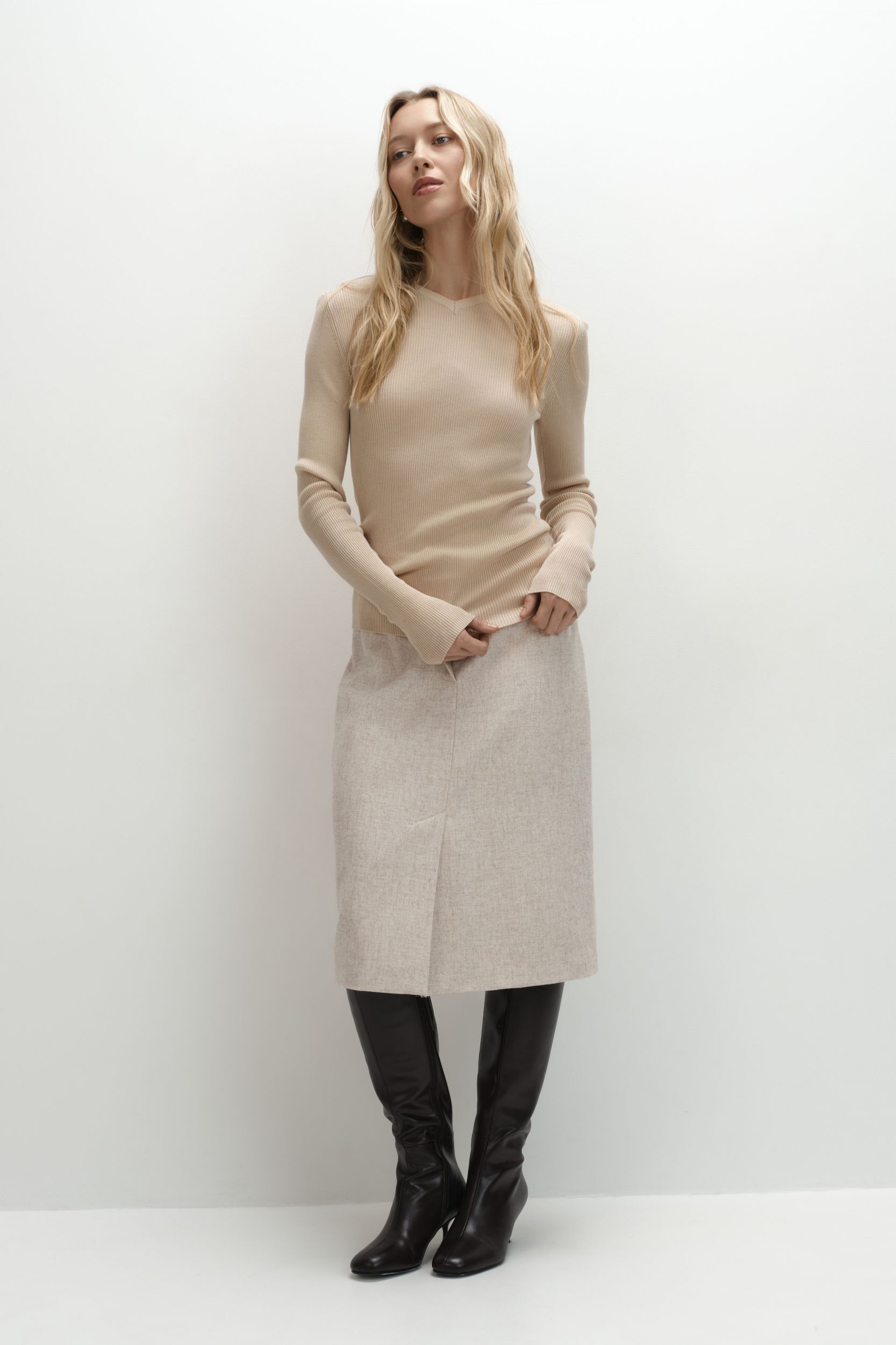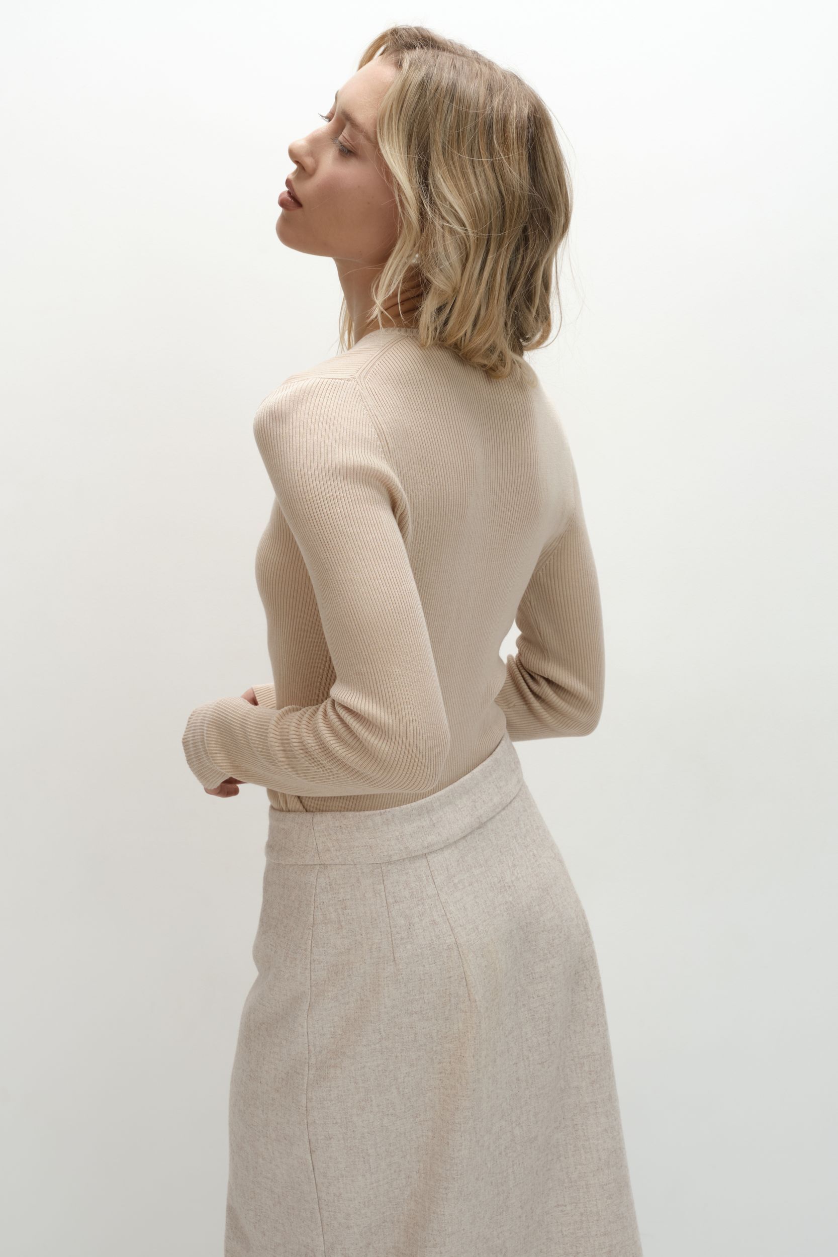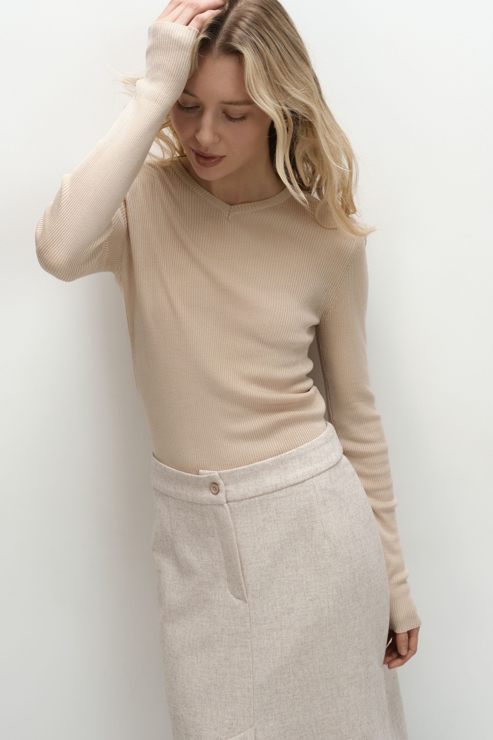 Лонгслив комфортного прилегающего силуэта с неглубоким V-образным вырезом – очень женственная модель из линейки трикотажа Drugaya. Выполнен из нежнейшей тонкой пряжи, в составе которой 20% шерсти и 80% тенсела. Красивый светлый бежевый оттенок отлично дополнит осенне-зимний гардероб. А плотность изделия позволяет комфортно носить лонгслив самостоятельно и первым слоем под жакеты и жилеты.