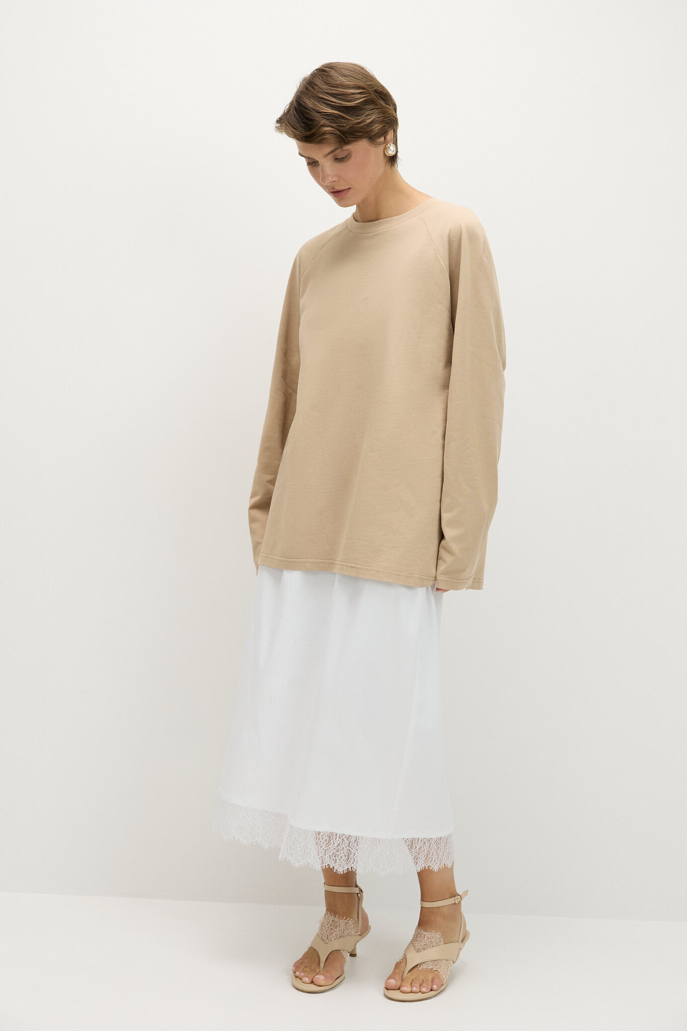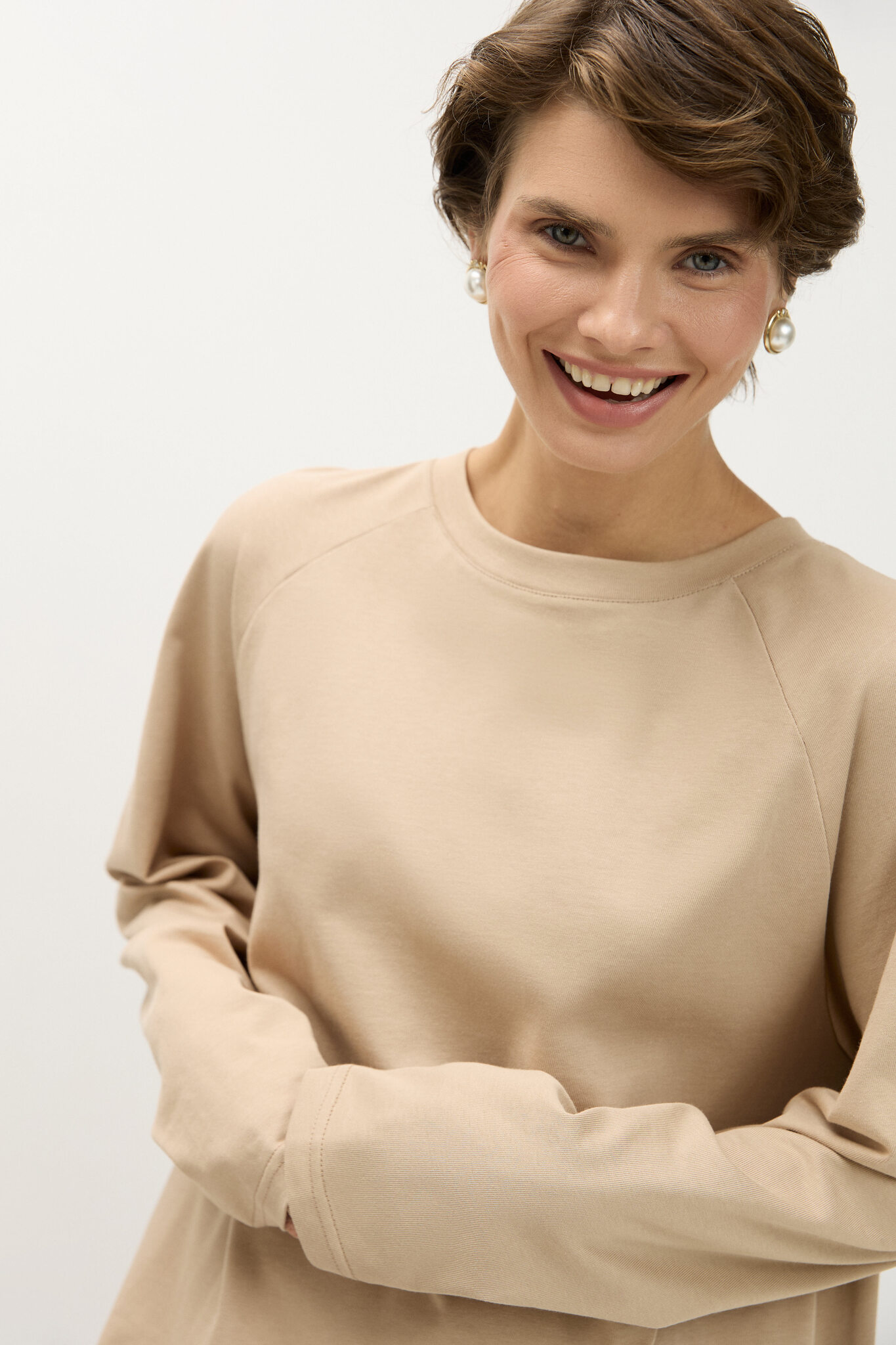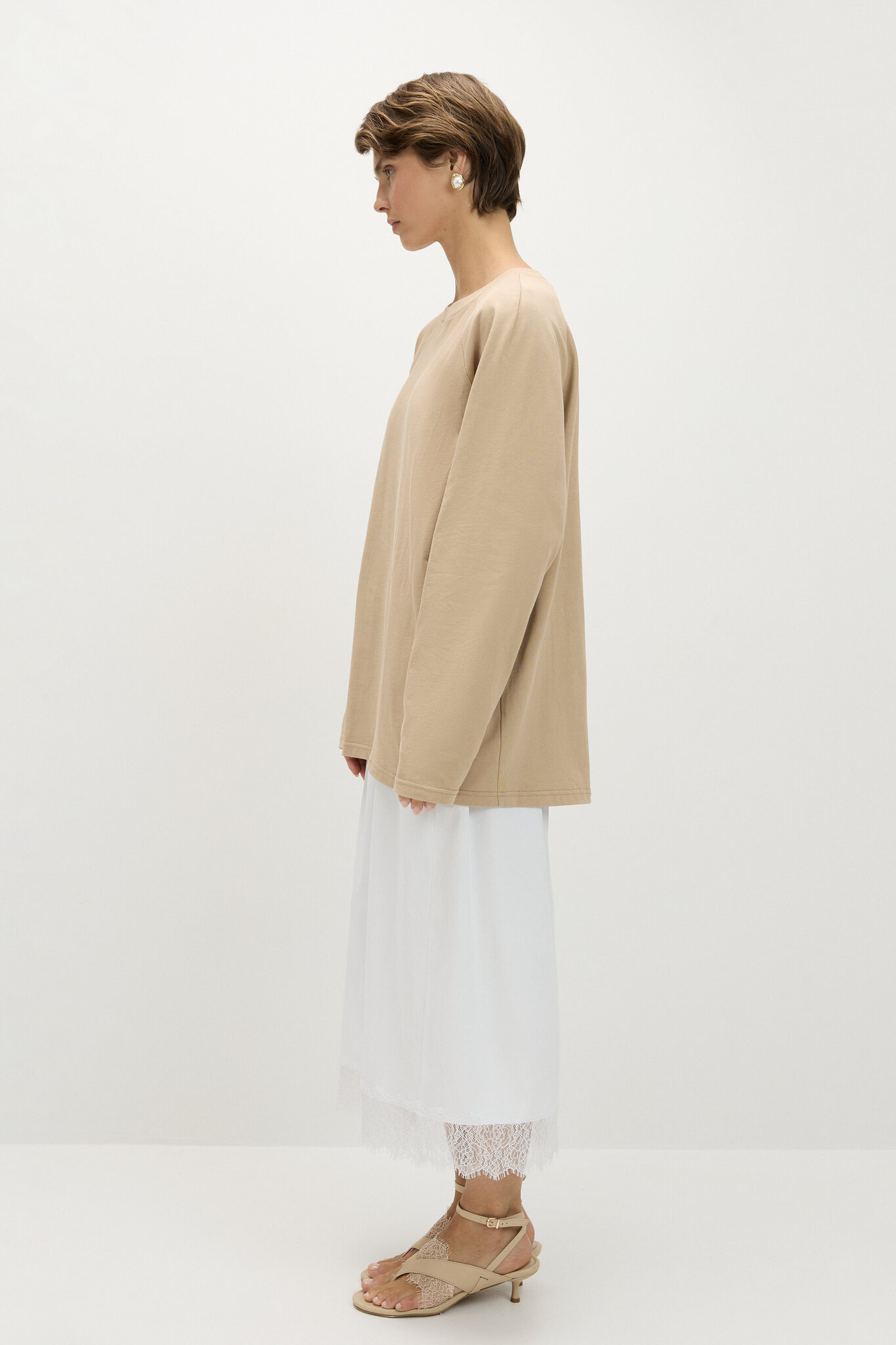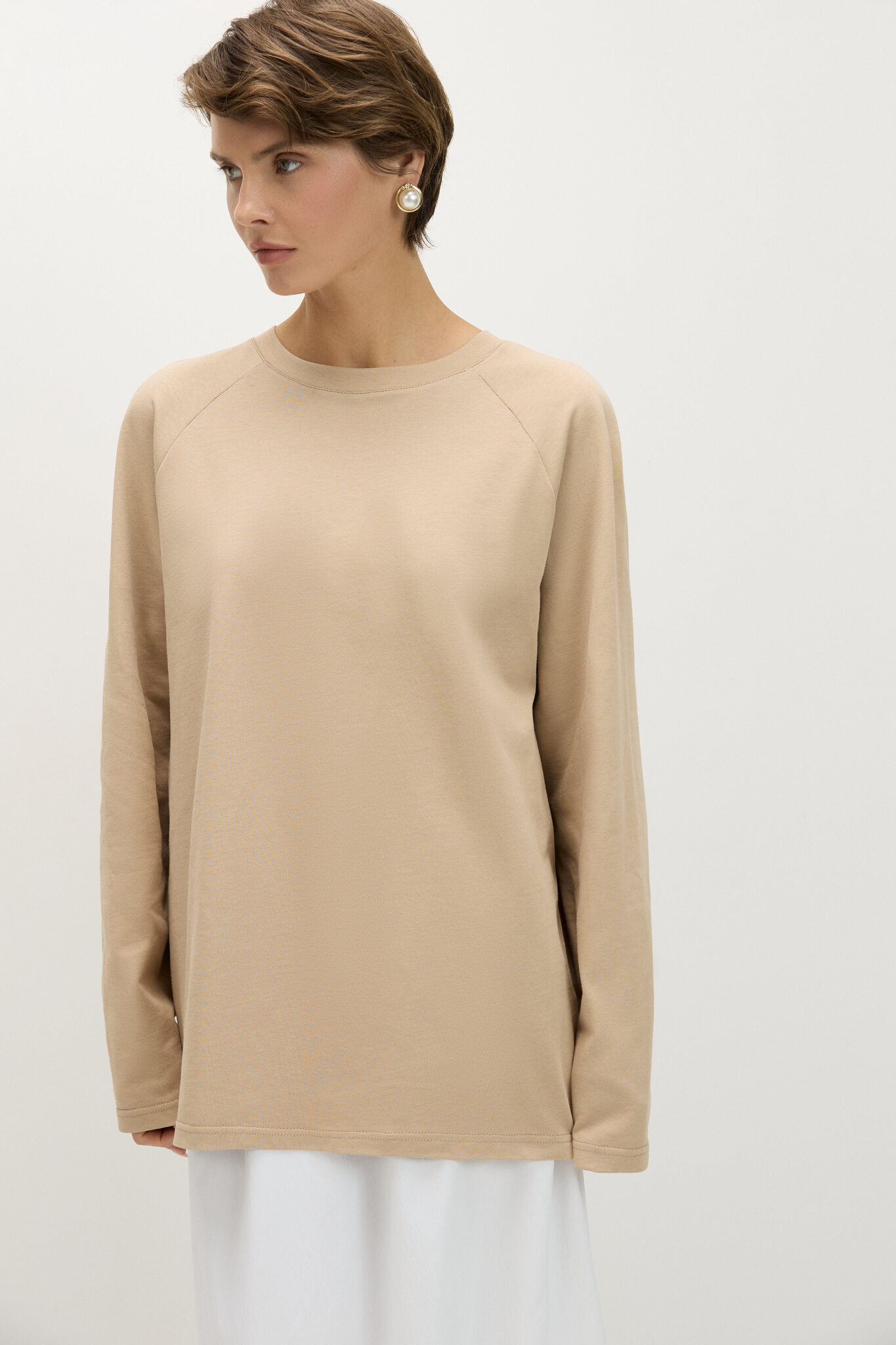Свободный лонгслив прямого силуэта с рукавами реглан - незаменимая база для расслабленных образов. Выполнен из 100% дышащего хлопка средней плотности. Дополнит городские уютные образы, а также станет отличным партнером собранным костюмам и романтичным юбкам.