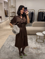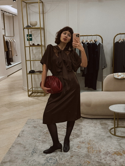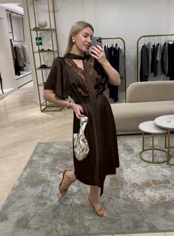 Ретро-платье с кружевными элементами, эффектными объемными плечами, V-образным вырезом и эластичной резинкой по талии. Две изящные ленты позволяют менять стиль и подчеркивать индивидуальность. Длина ниже колена придает образу элегантность и универсальность. Идеальный выбор для особых случаев и уютных прогулок.