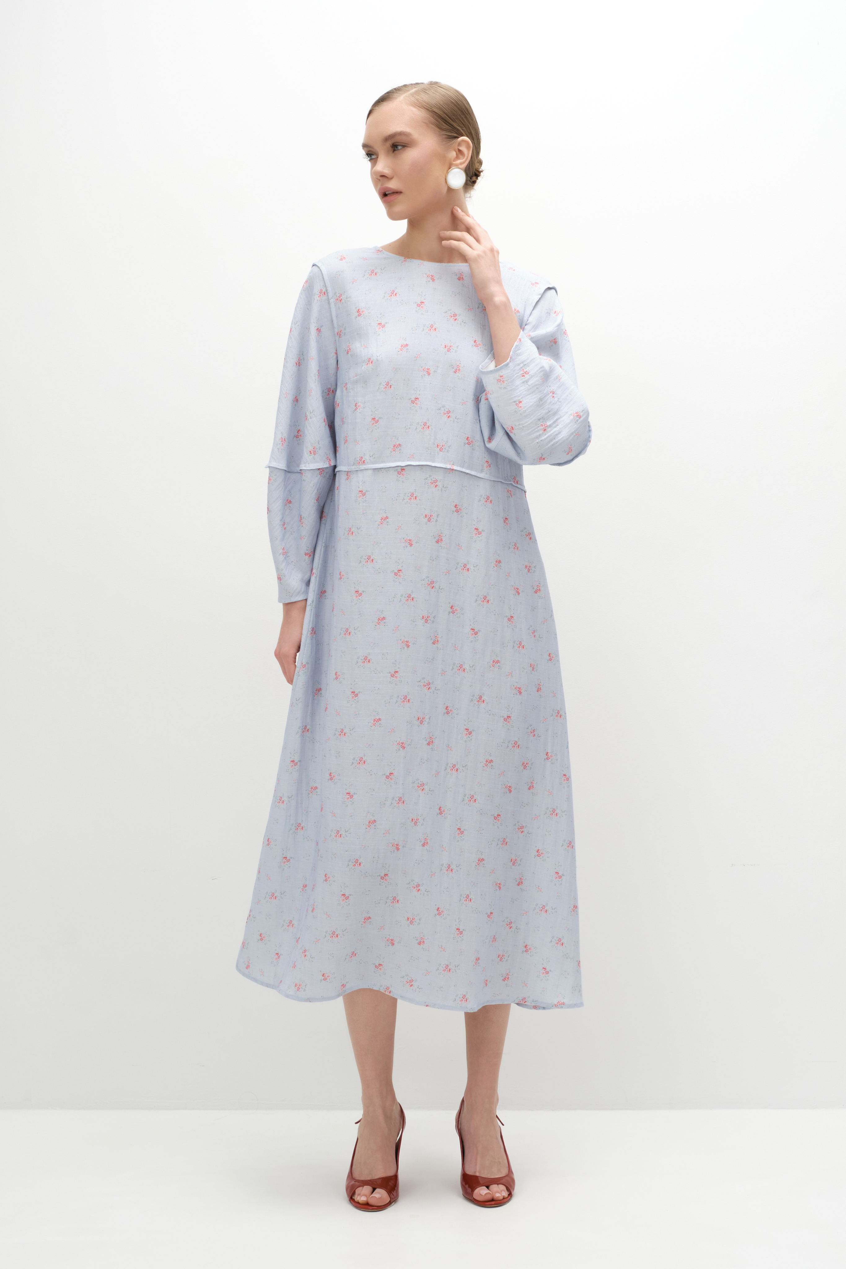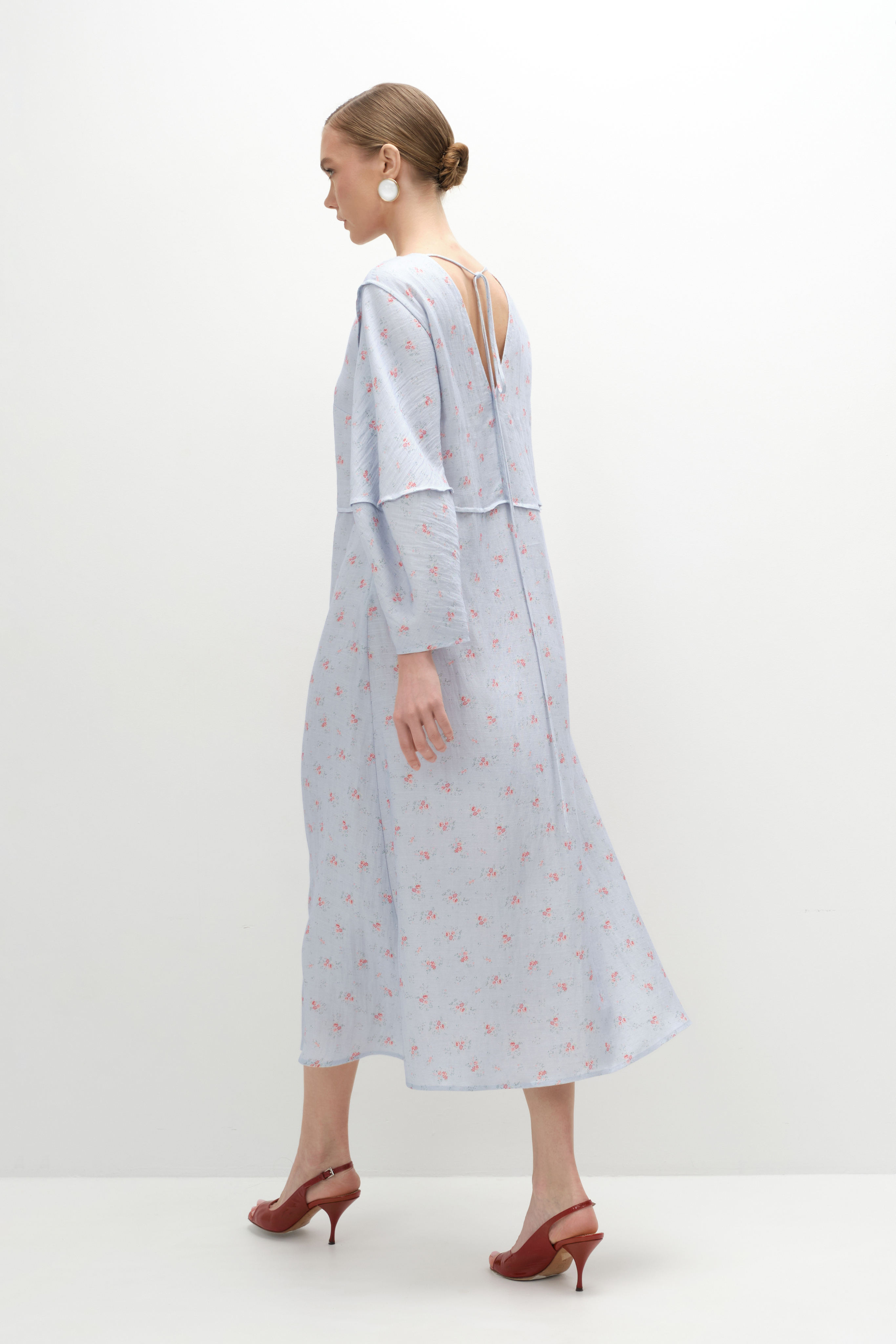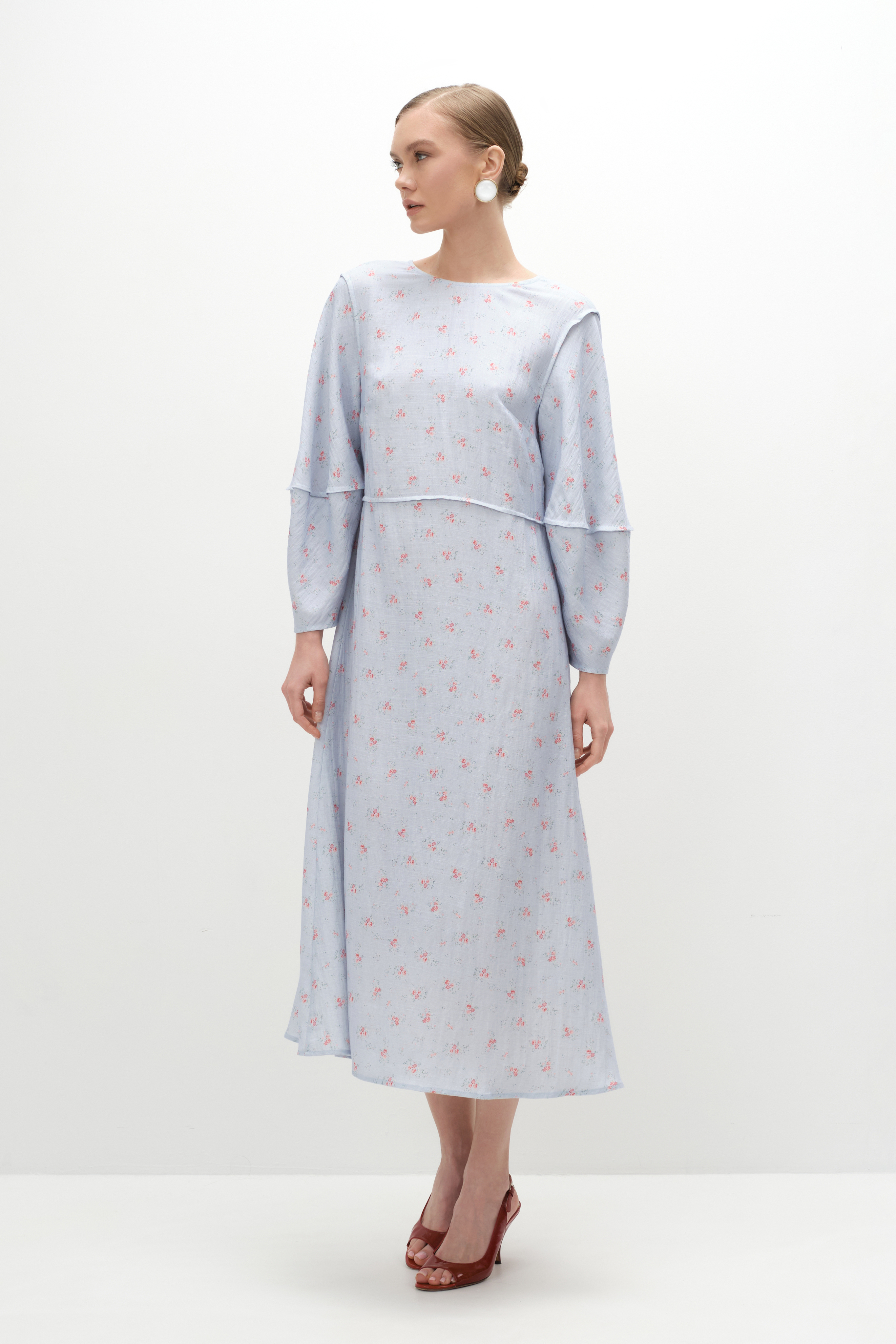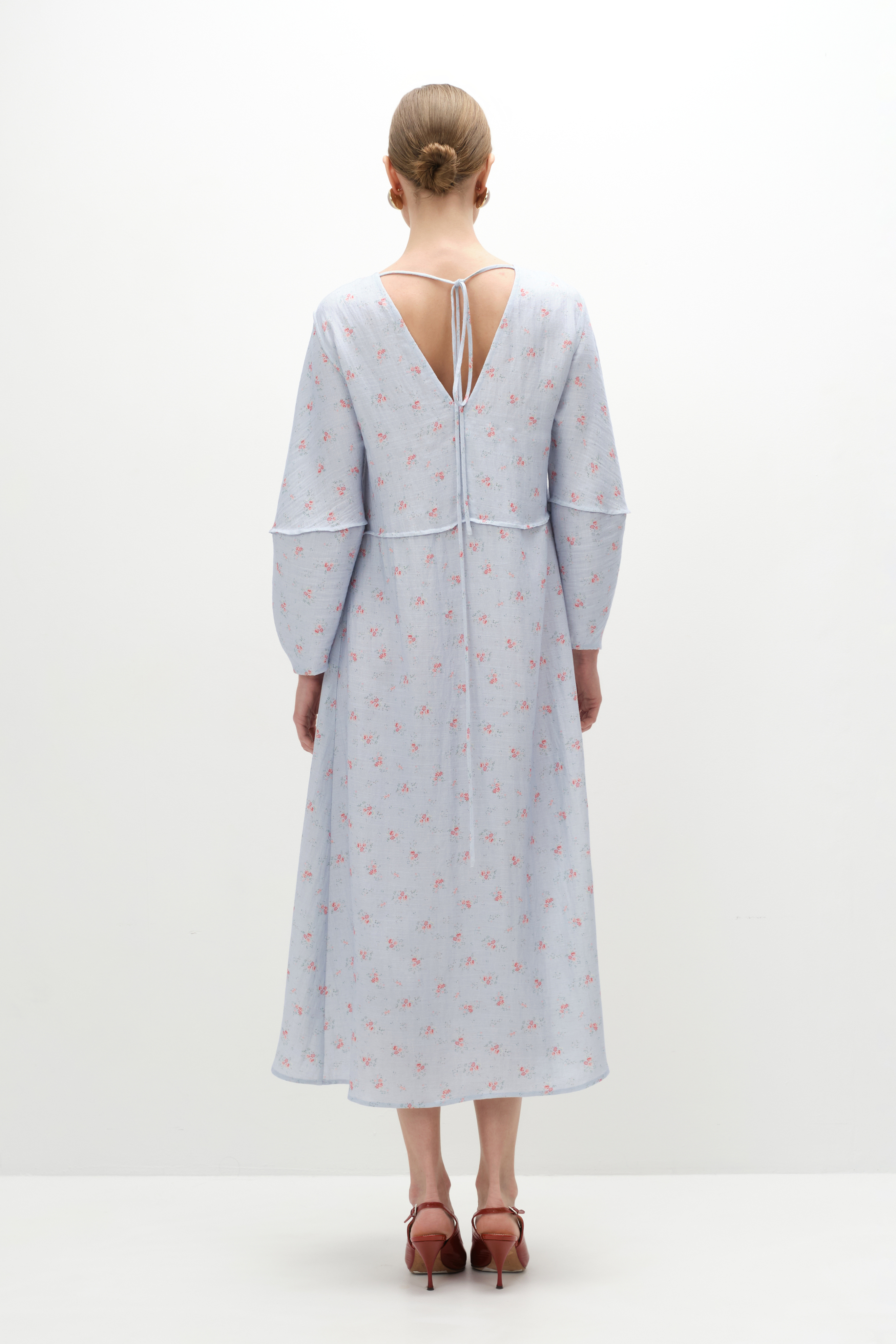 Платье полуприталенного силуэта с пышными рукавами длиной 7/8 и V-образным вырезом. По спинке расположены завязки. Выполнено из плотной плательной вискозы, застёгивается на потайную молнию сбоку. Изделие имеет отрезную линию талии, которая формирует красивый женственный силуэт. Перед платья, от плечевого шва до линии талии, посажен на тонкий хлопковый подклад для комфортной носки без нижнего белья.