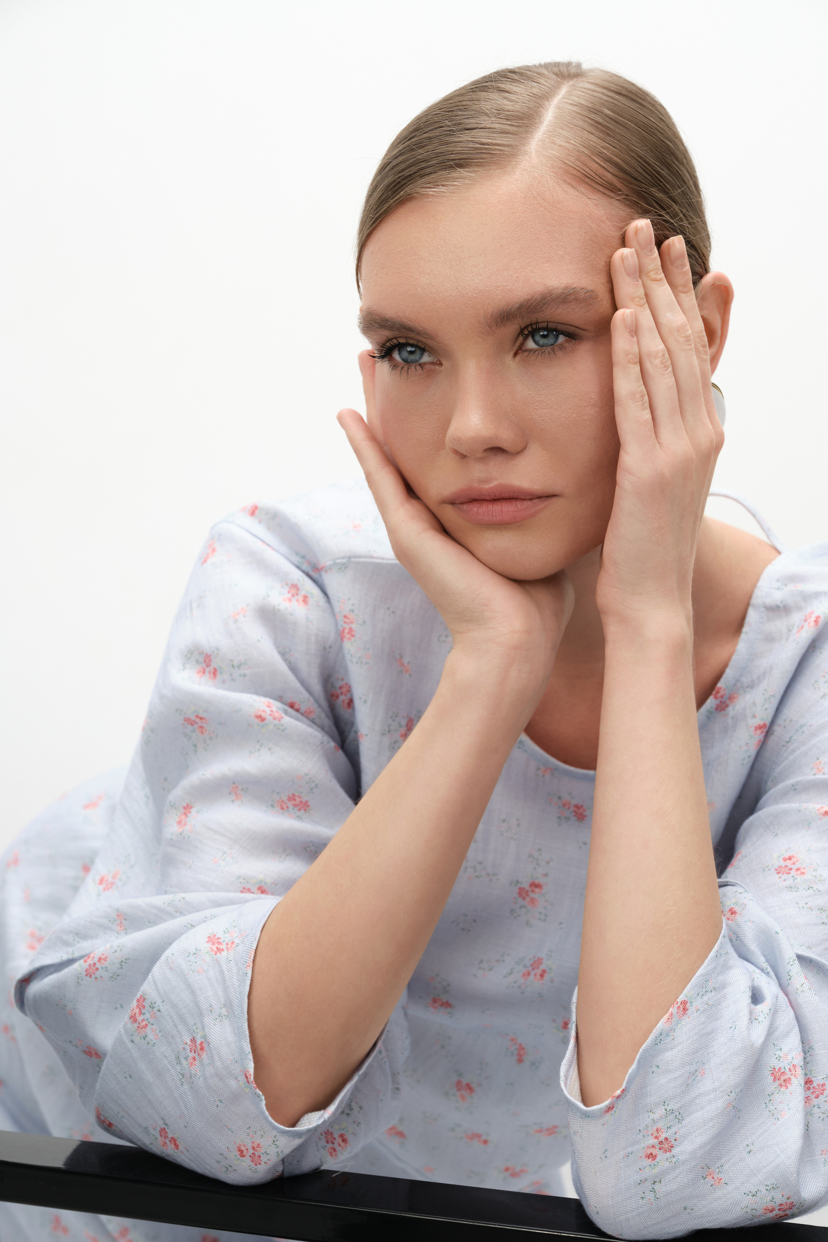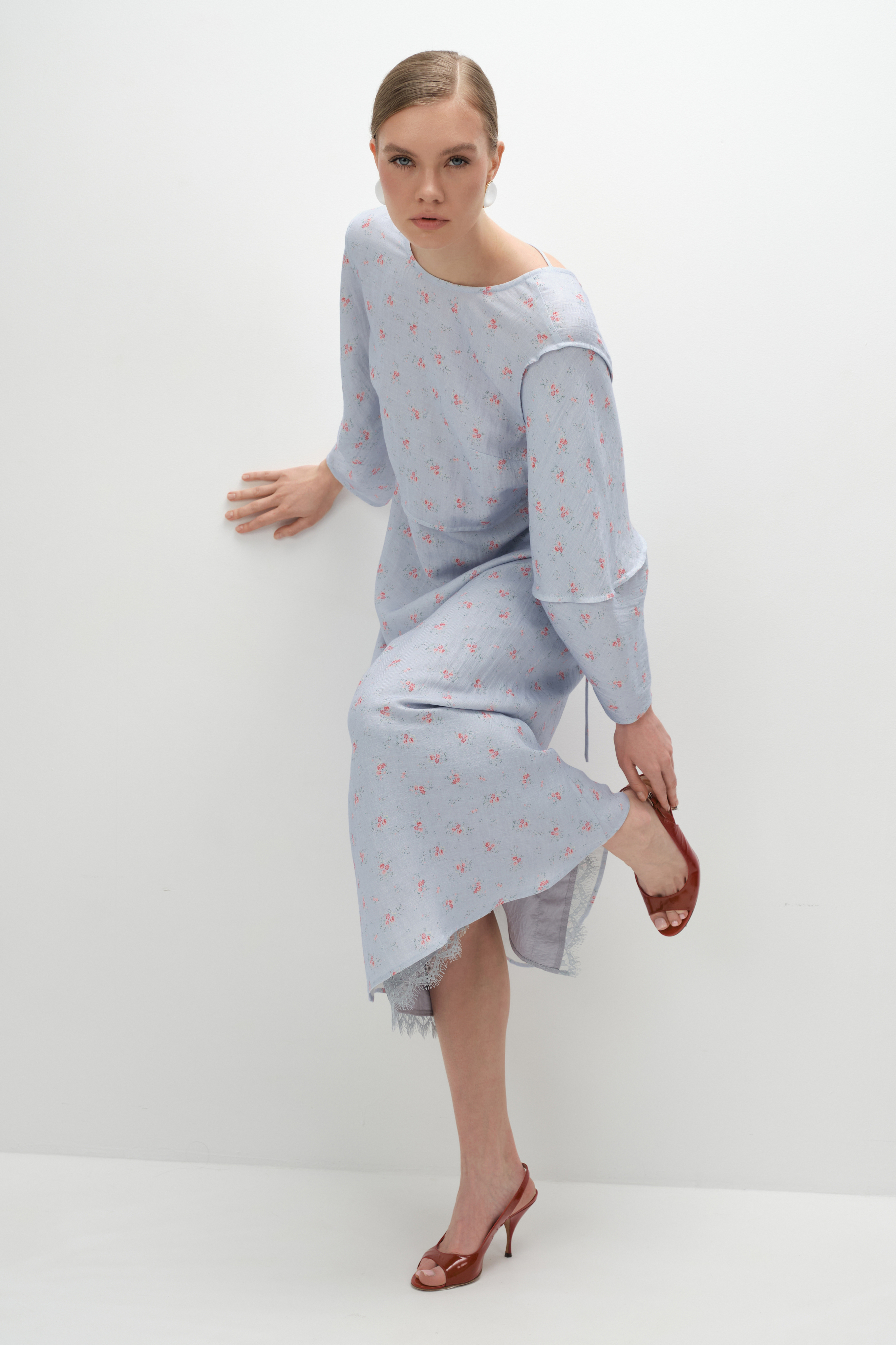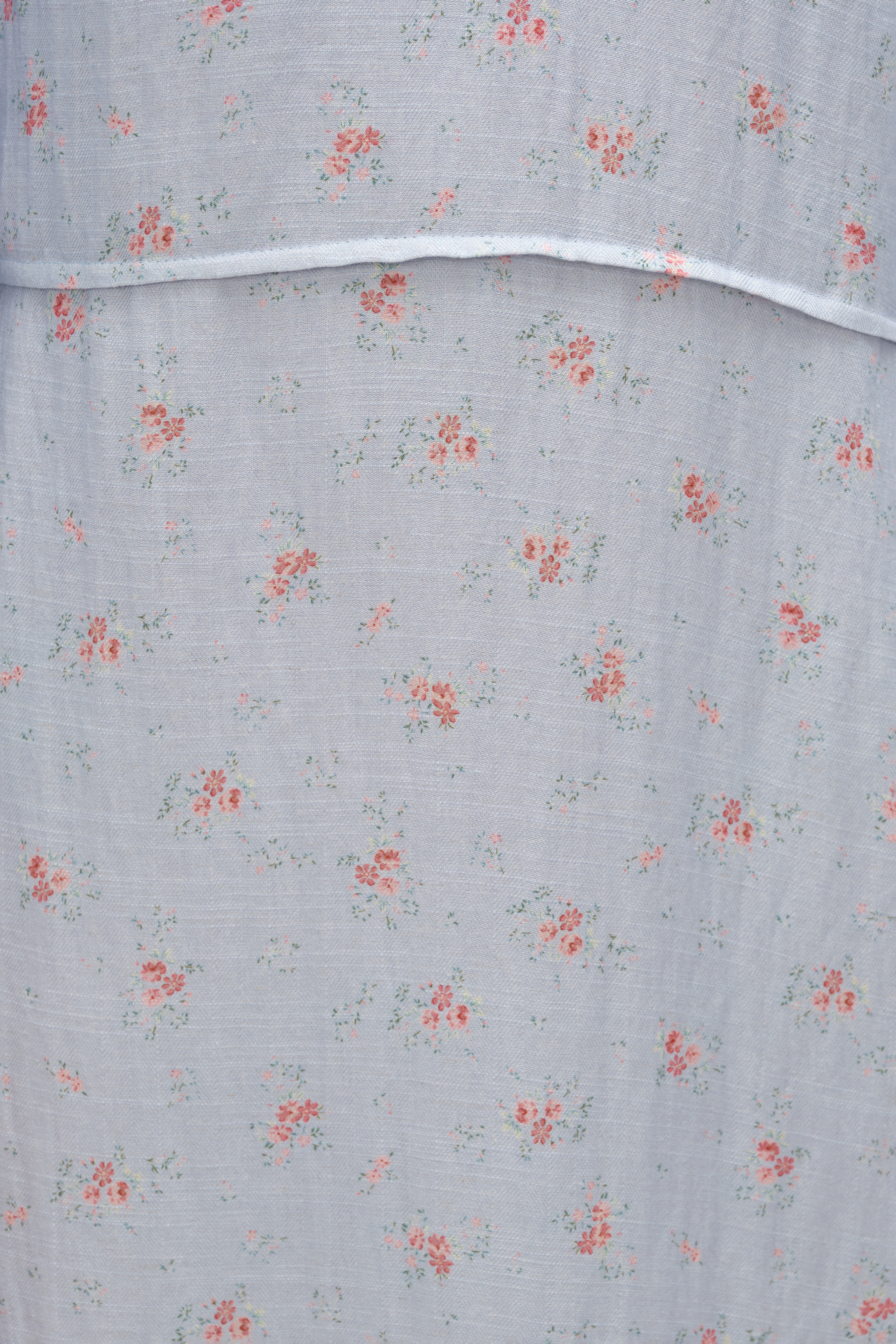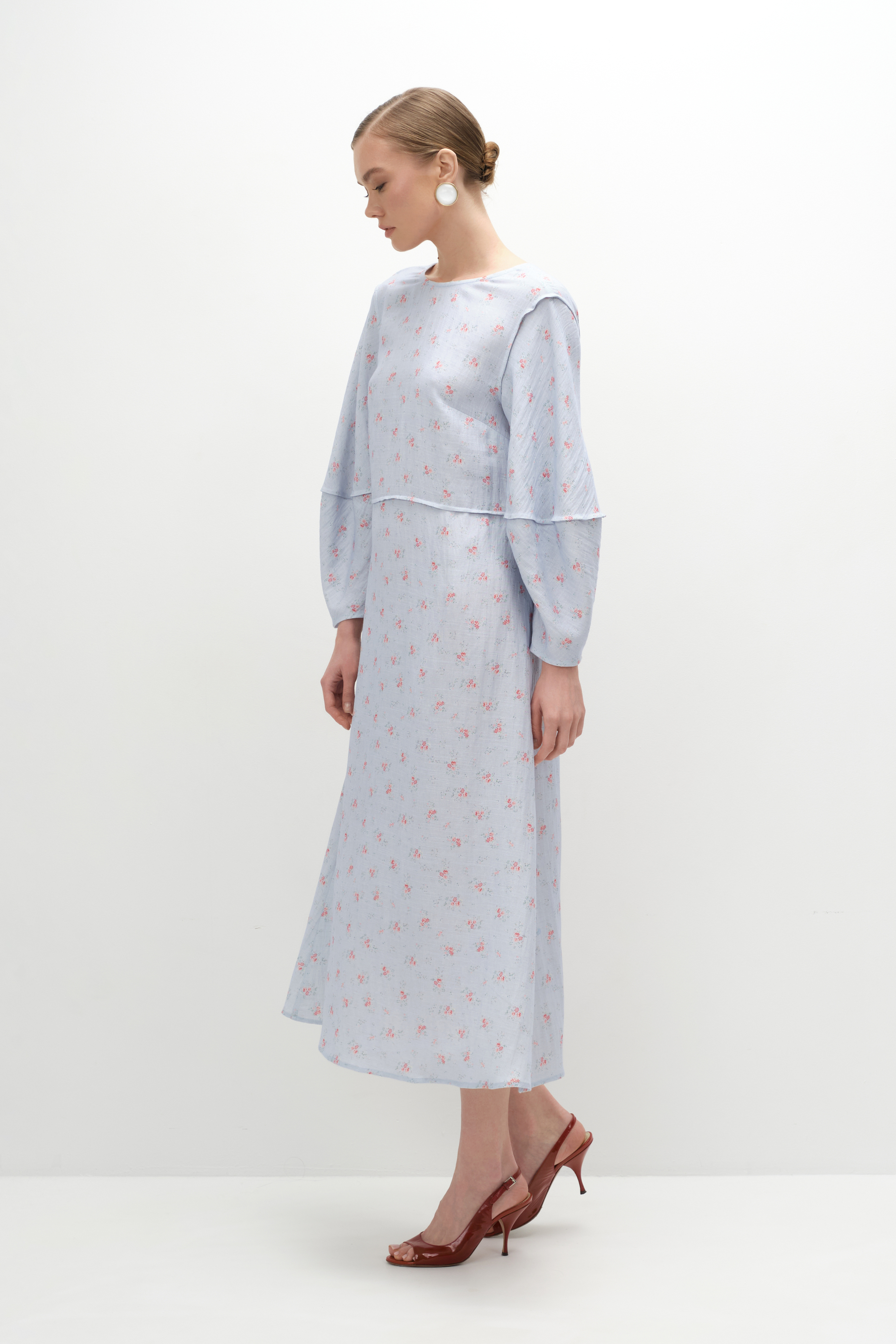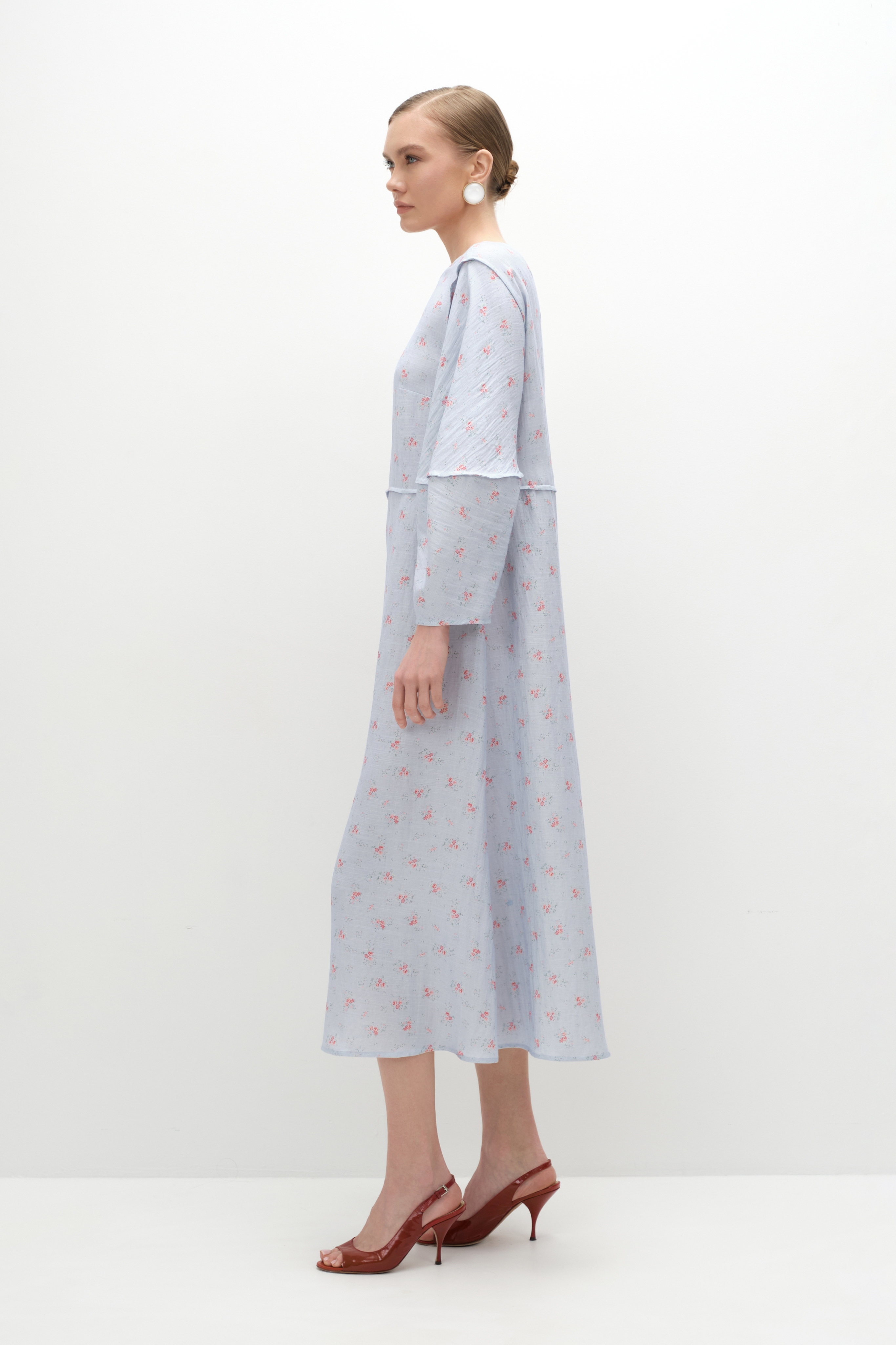 Платье полуприталенного силуэта с пышными рукавами длиной 7/8 и V-образным вырезом. По спинке расположены завязки. Выполнено из плотной плательной вискозы, застёгивается на потайную молнию сбоку. Изделие имеет отрезную линию талии, которая формирует красивый женственный силуэт. Перед платья, от плечевого шва до линии талии, посажен на тонкий хлопковый подклад для комфортной носки без нижнего белья.