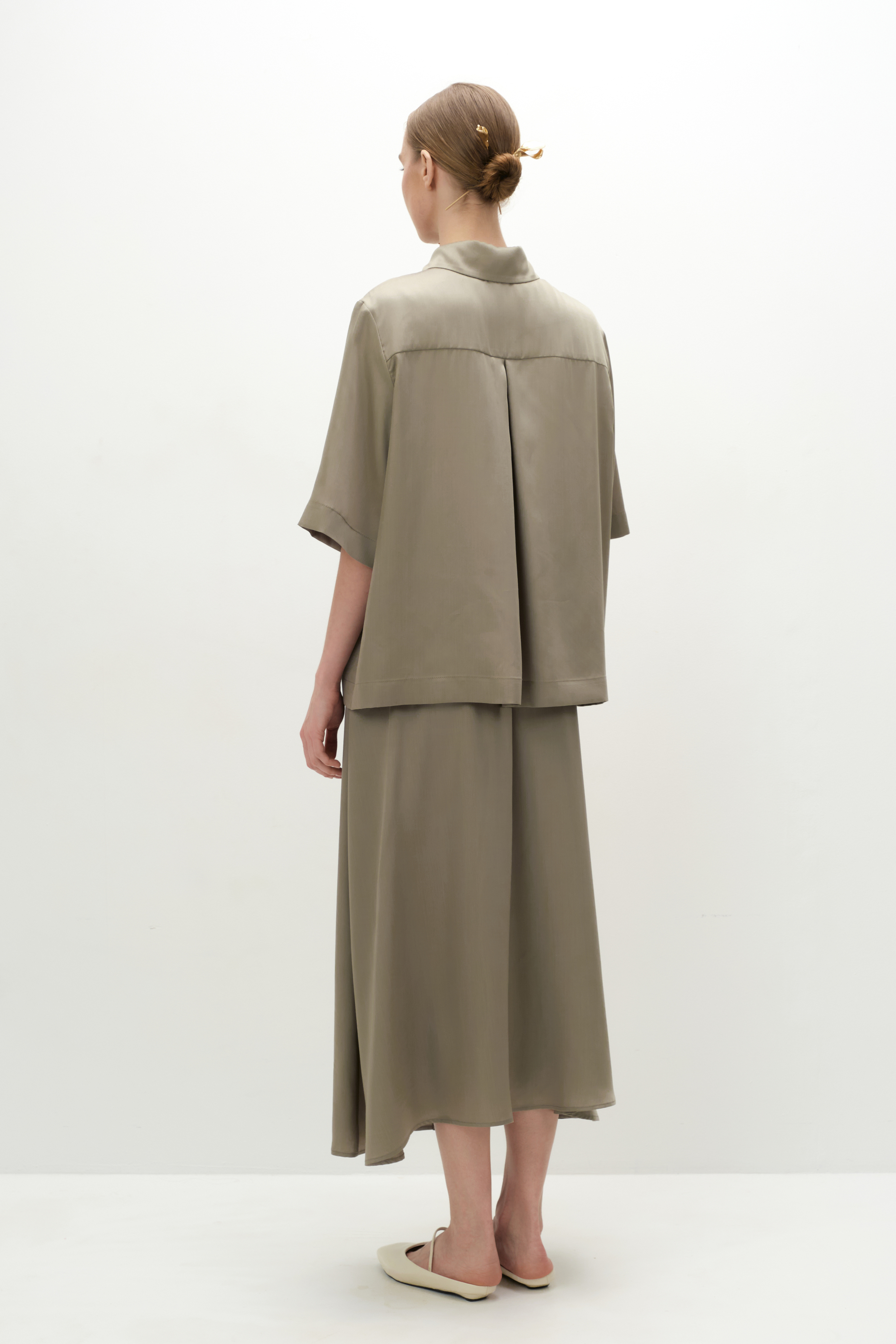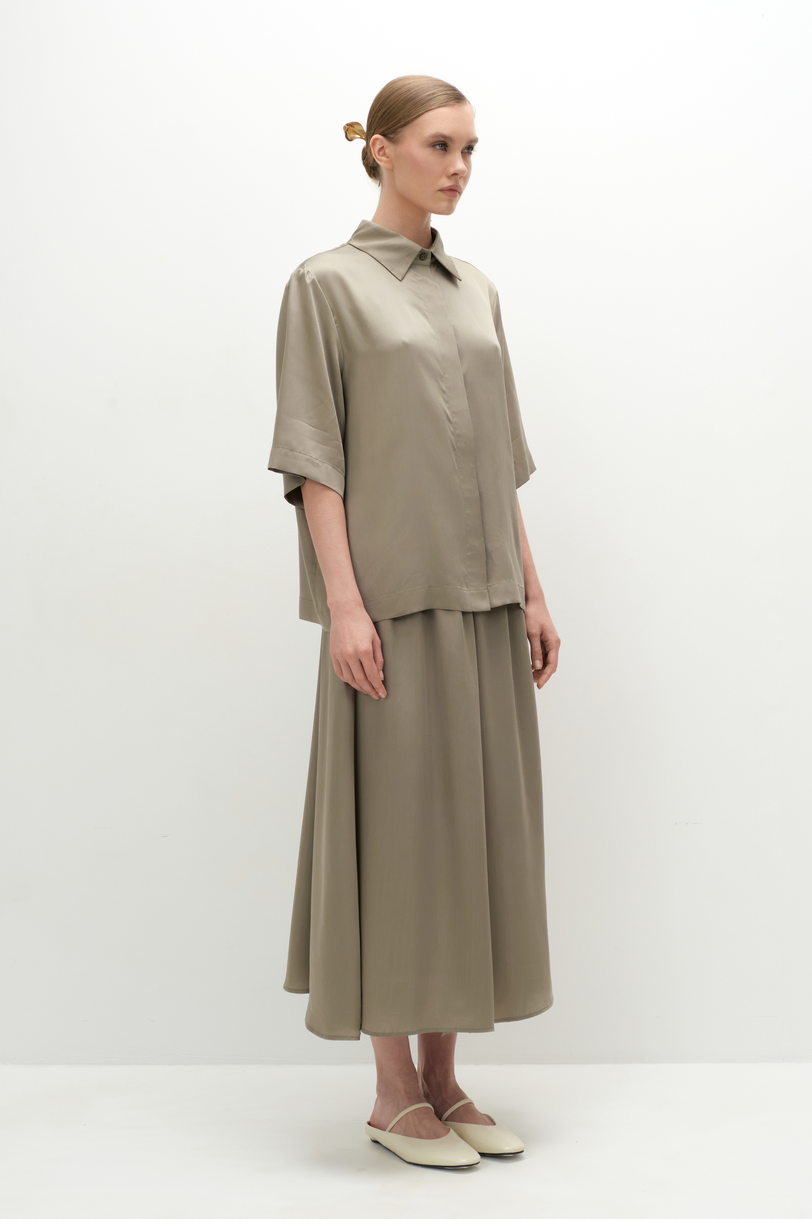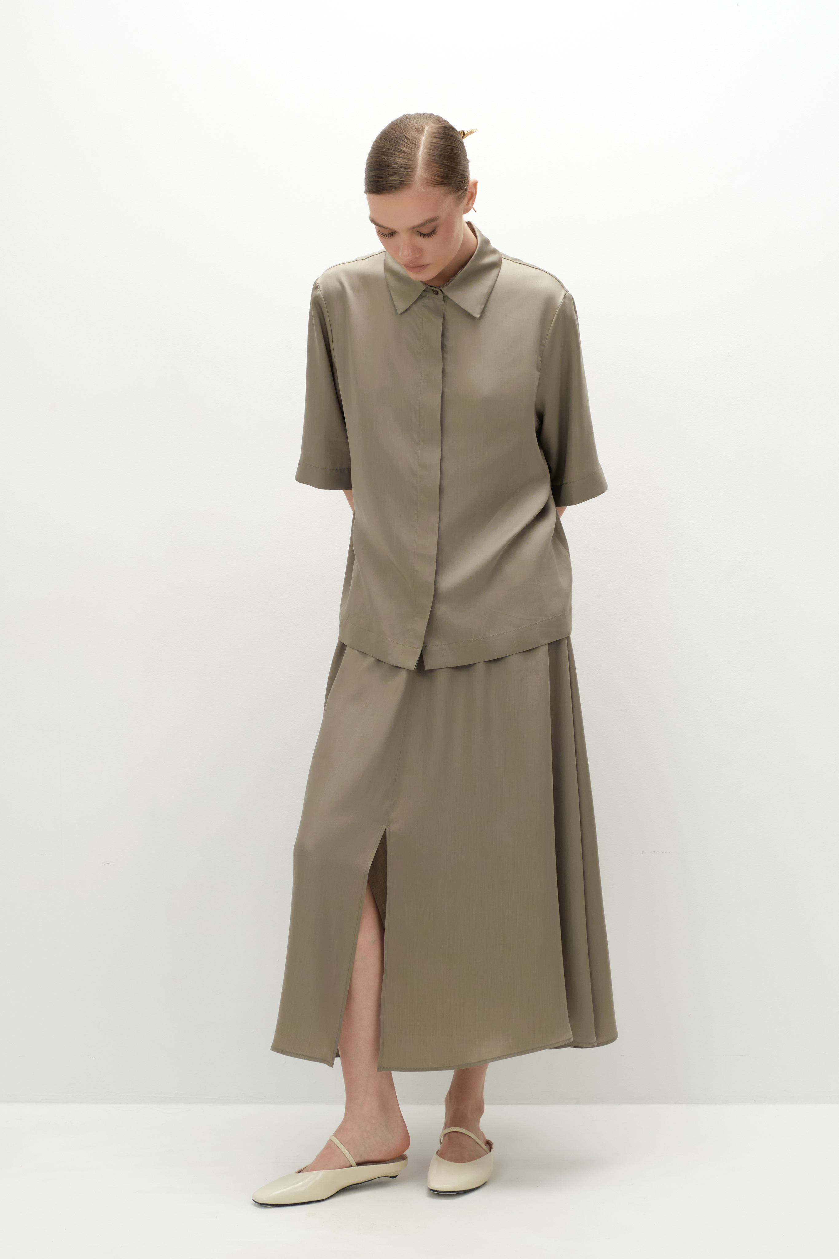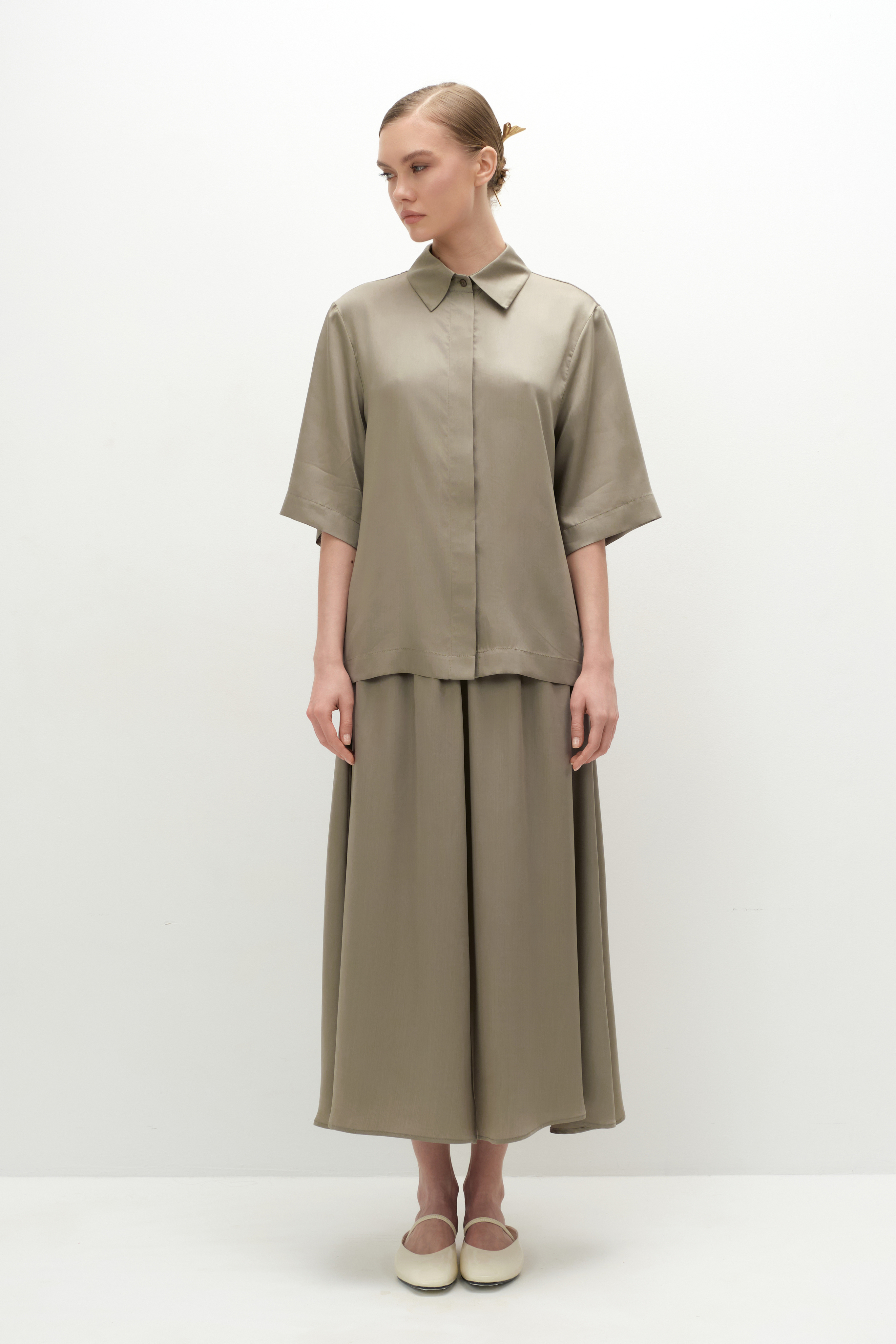 Рубашка объёмного кроя с аккуратной спущенной линией плеча и классическим воротником выполнена из струящегося тенсела и застёгивается на пуговицы в тон изделия. В пару можно выбрать брюки, юбку и/или шорты с кружевом из такой же ткани, а также дополнить сет топом. Такой костюм выручит в любой ситуации, а также удобен для путешествий, так как занимает очень мало места в чемодане.