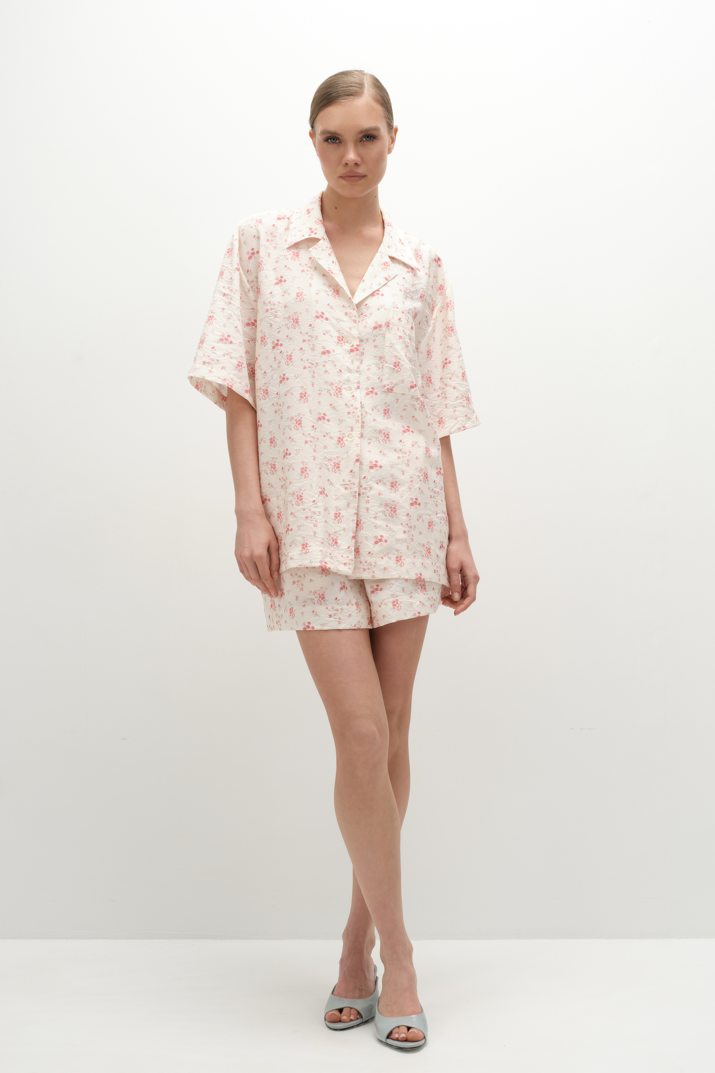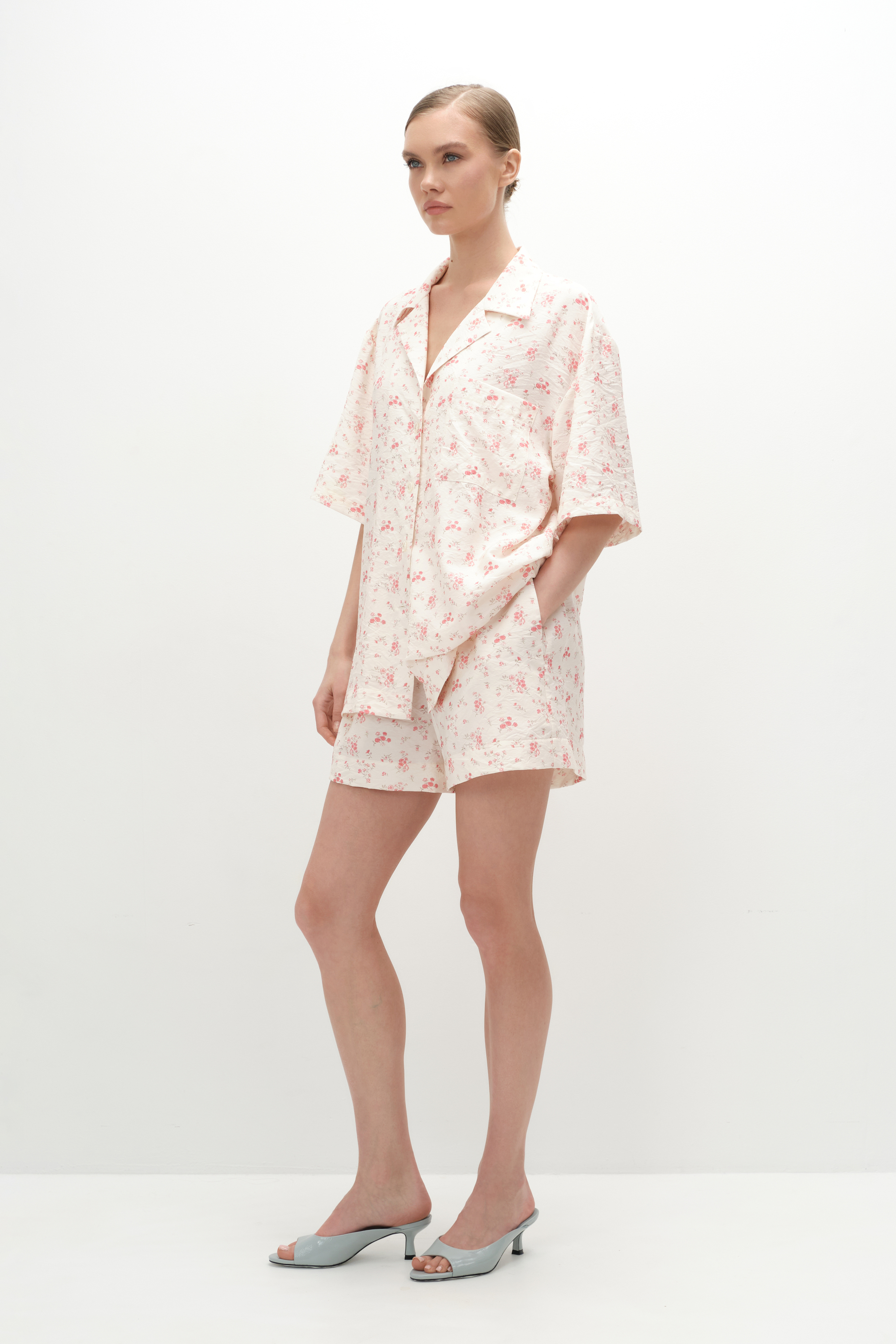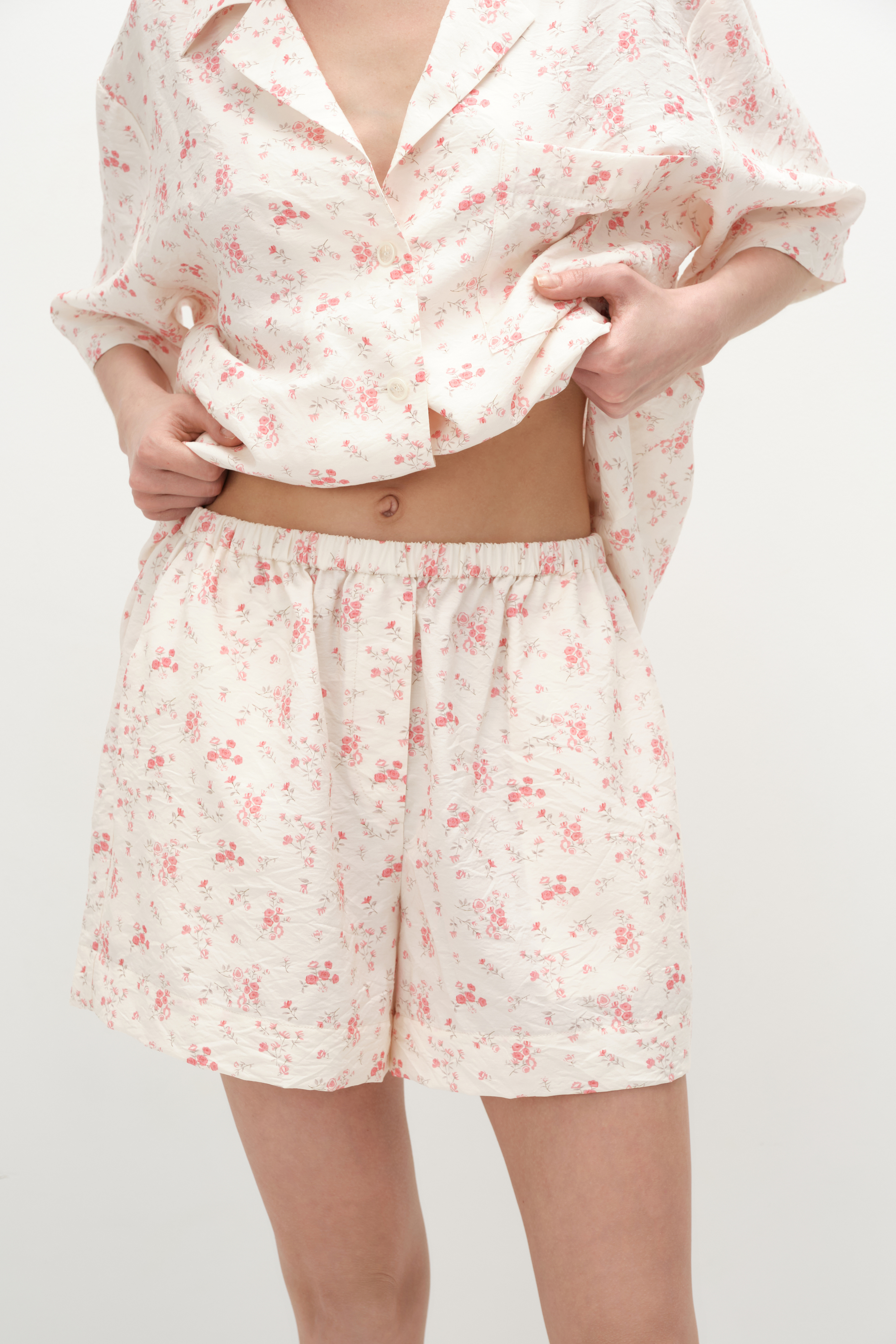 Расслабленные шорты в пижамном стиле в цветочный принт. Выполнены из матовой фактурной вискозы, на резинке, с аккуратными диагональными карманами. В пару можно выбрать блузу с коротким рукавом из такой же ткани и дополнить образ юбкой. Получится идеальный сет как для загородного неспешного отдыха, так и для вечерних выходов, а также он удобен для путешествий, так как занимает очень мало места в чемодане.