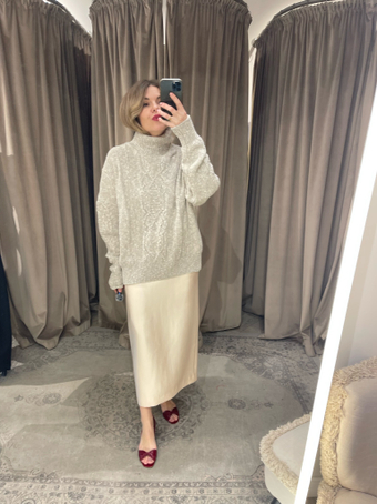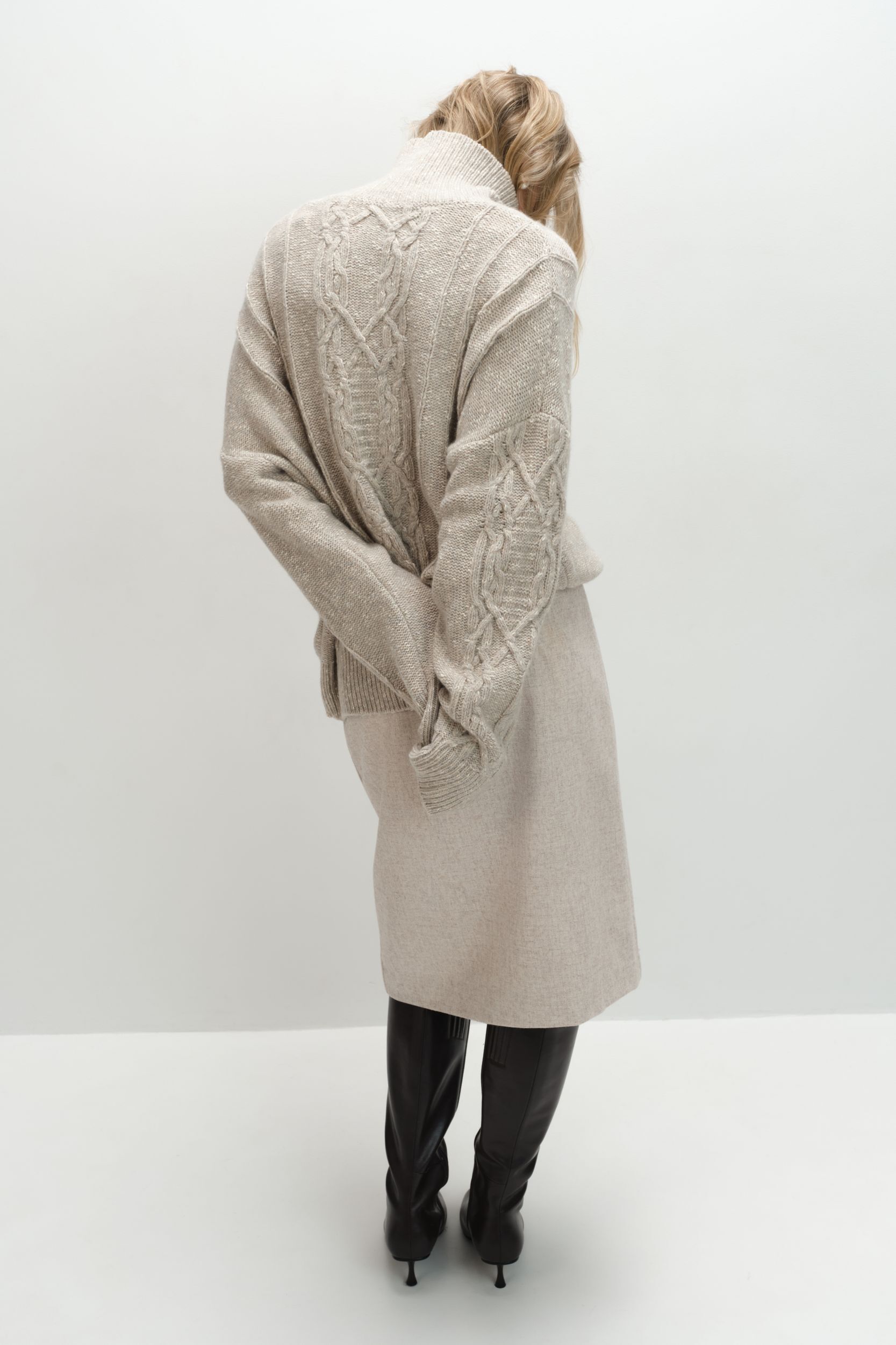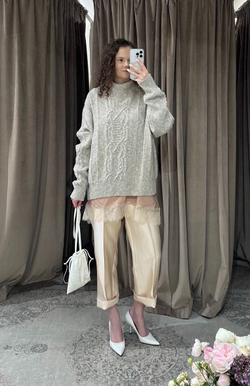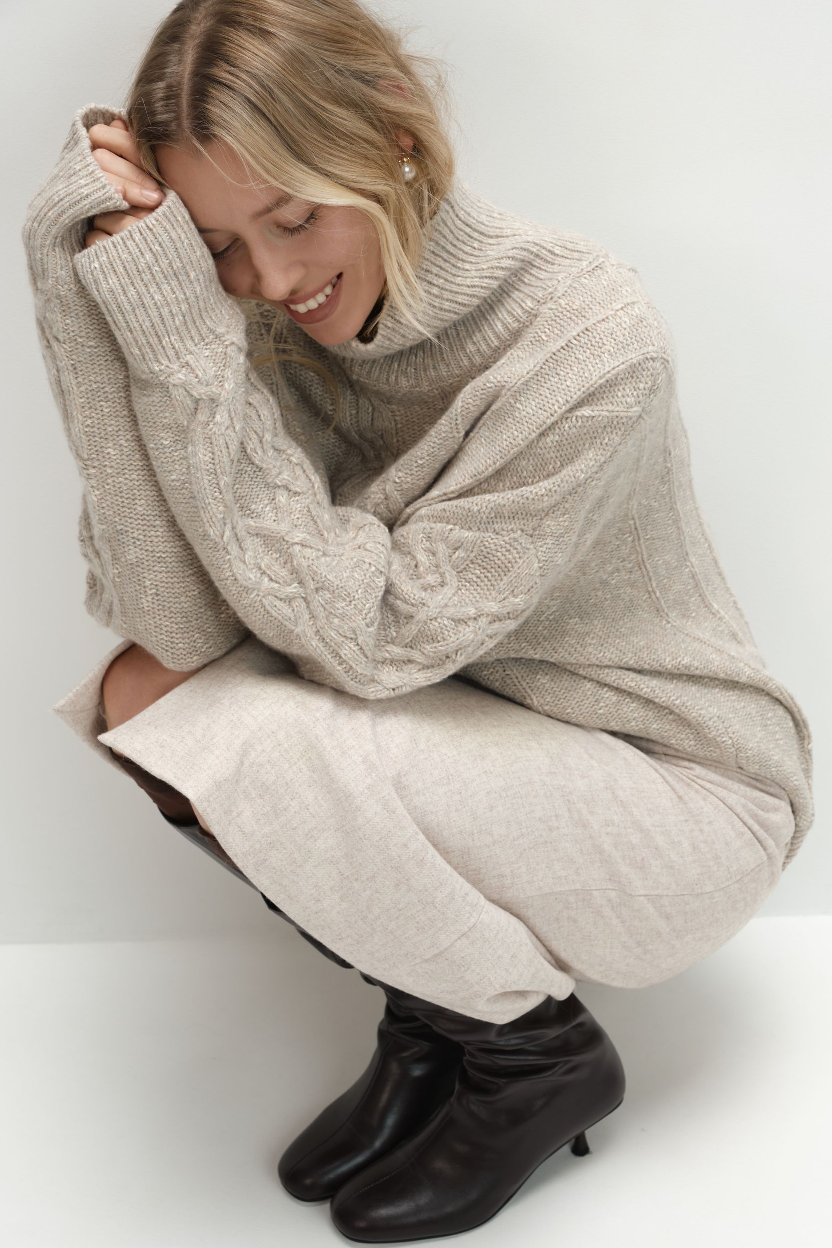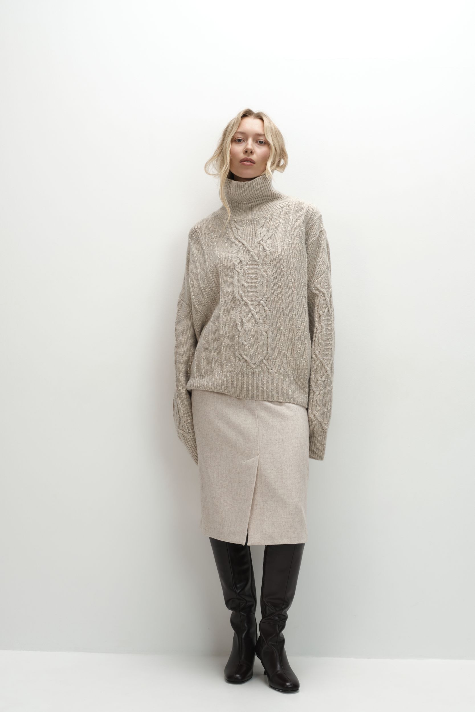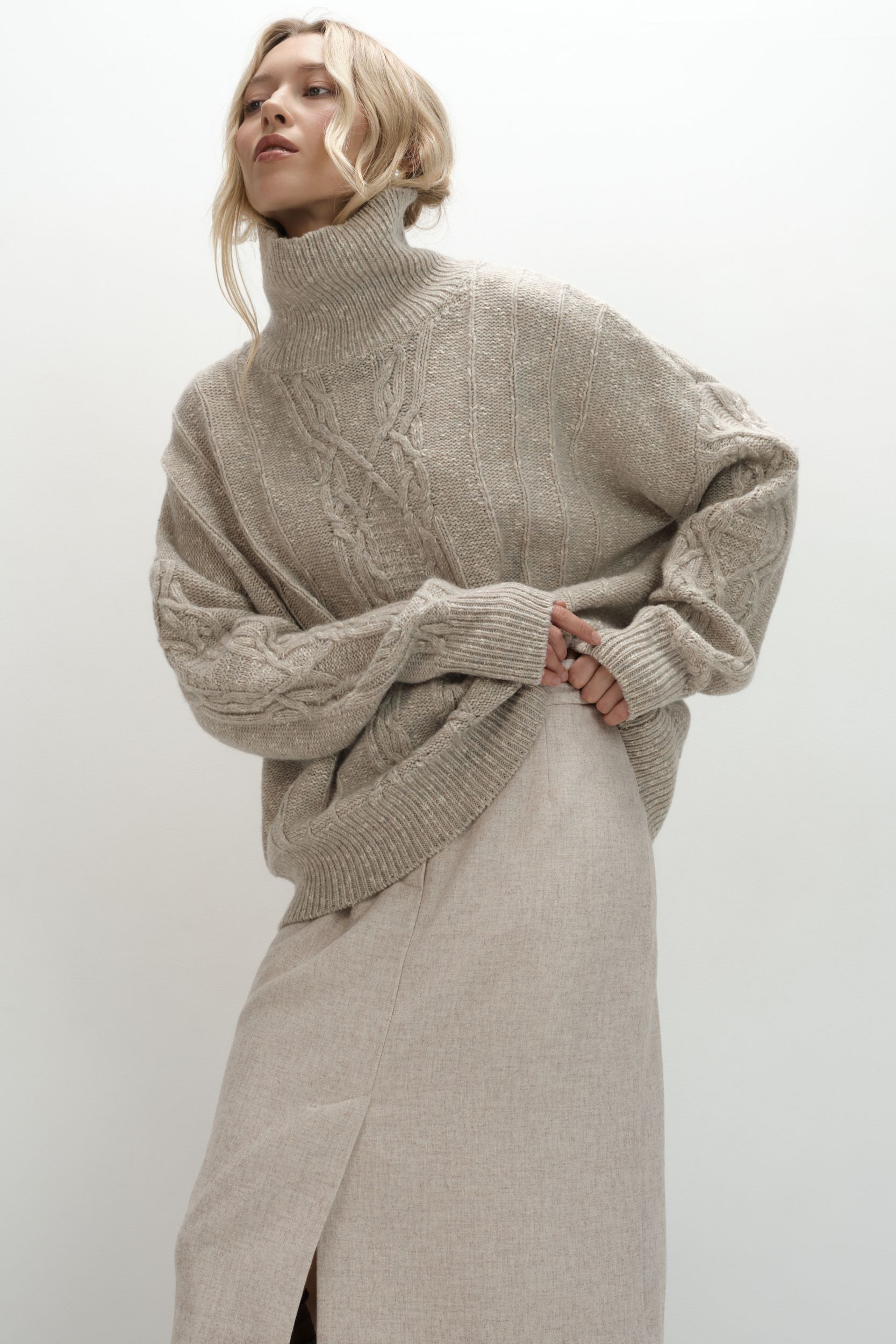 Уютный свитер из мягкой шерсти с добавлением хлопка с меланжевым эффектом. Украшен узорами в виде крупных кос, это напомнило нам дедушкин свитер из детства, от этого он еще теплее. Правильная длина чуть ниже косточек и свободные резинки по низу изделия и на рукавах не добавляют лишнего объема. Представлен в едином размере, который хорошо садится от XS до L.