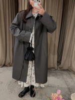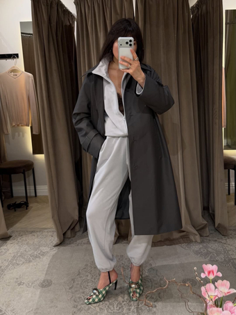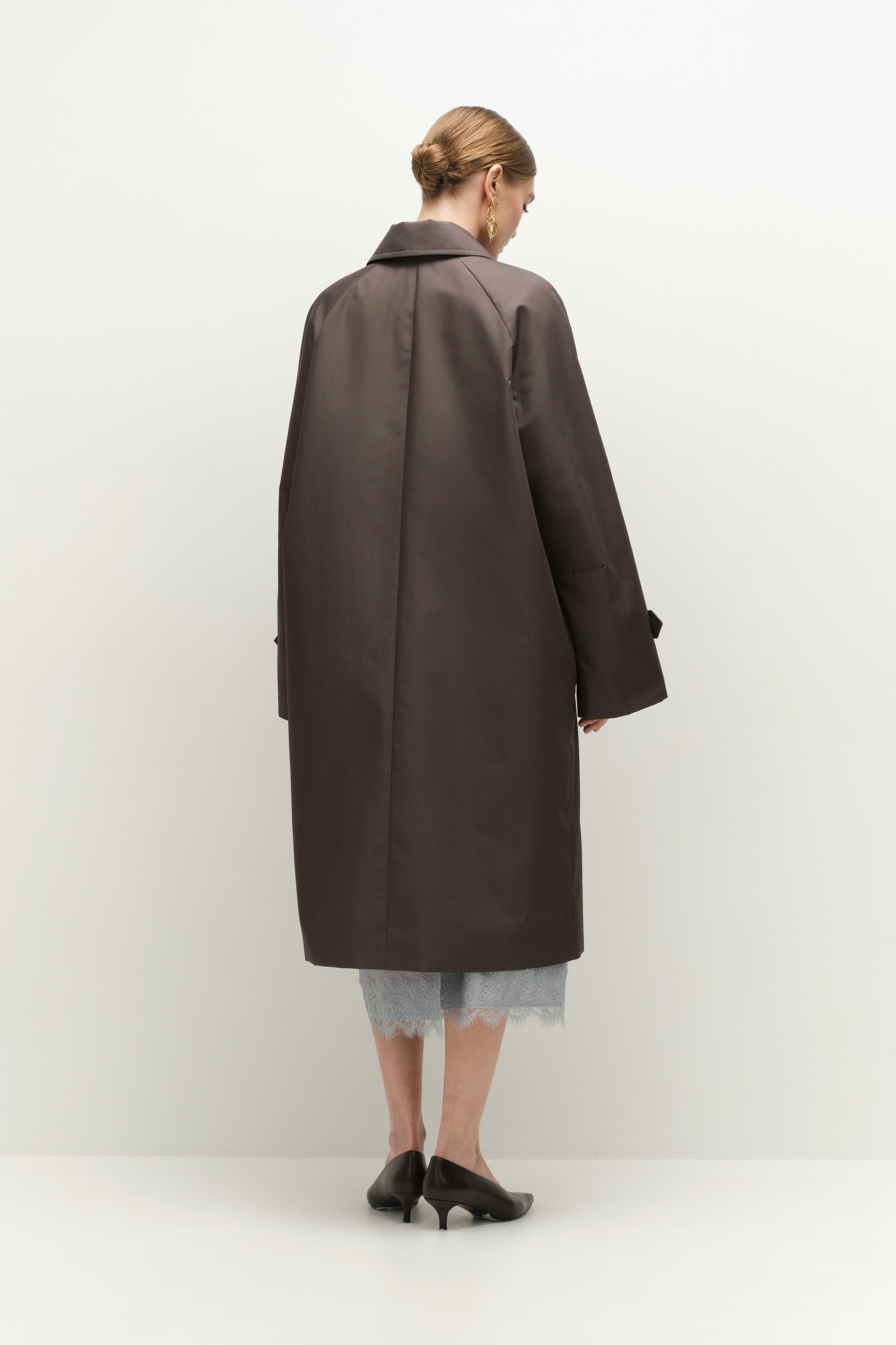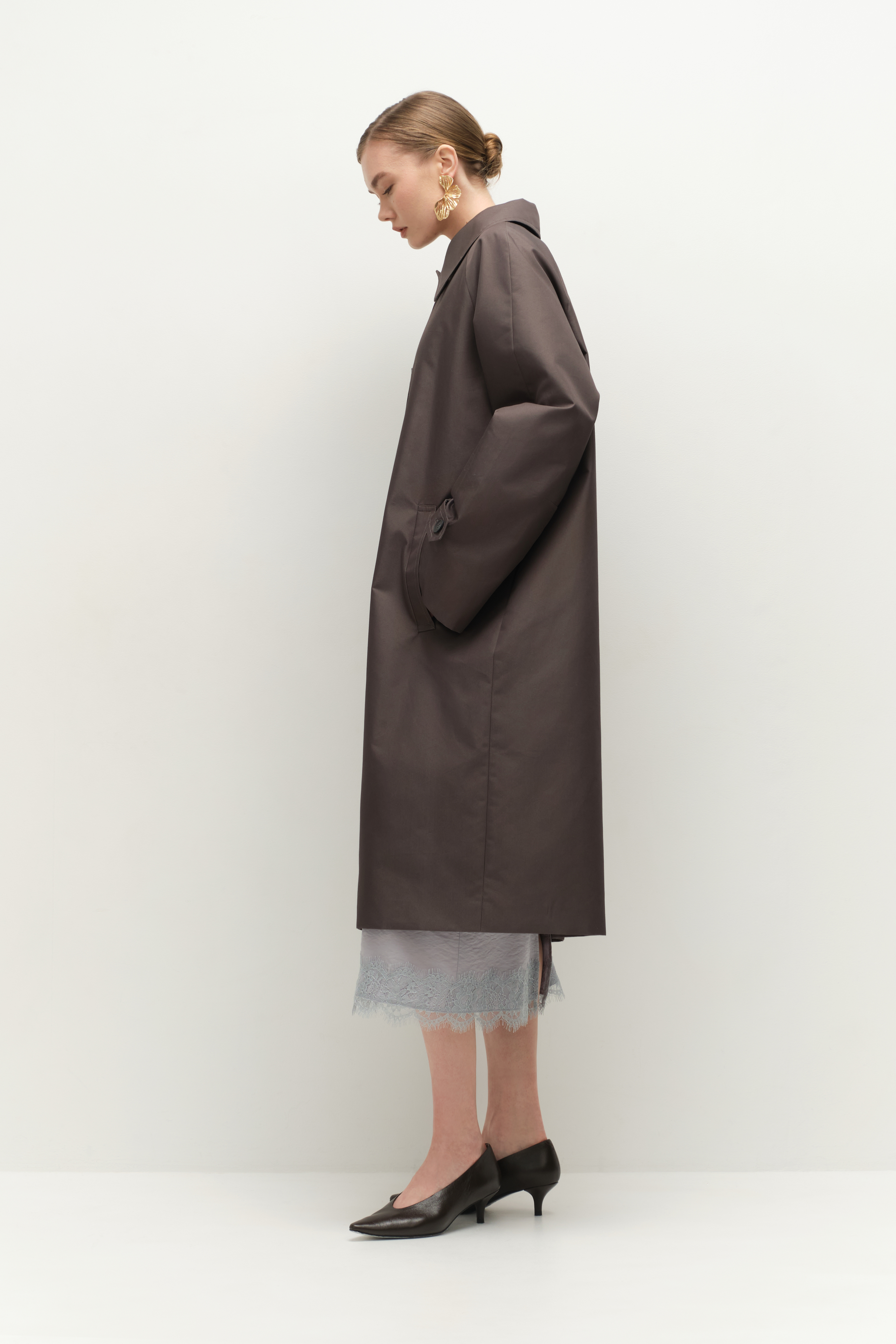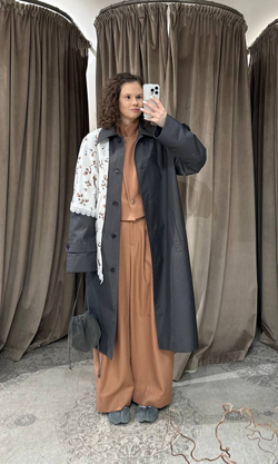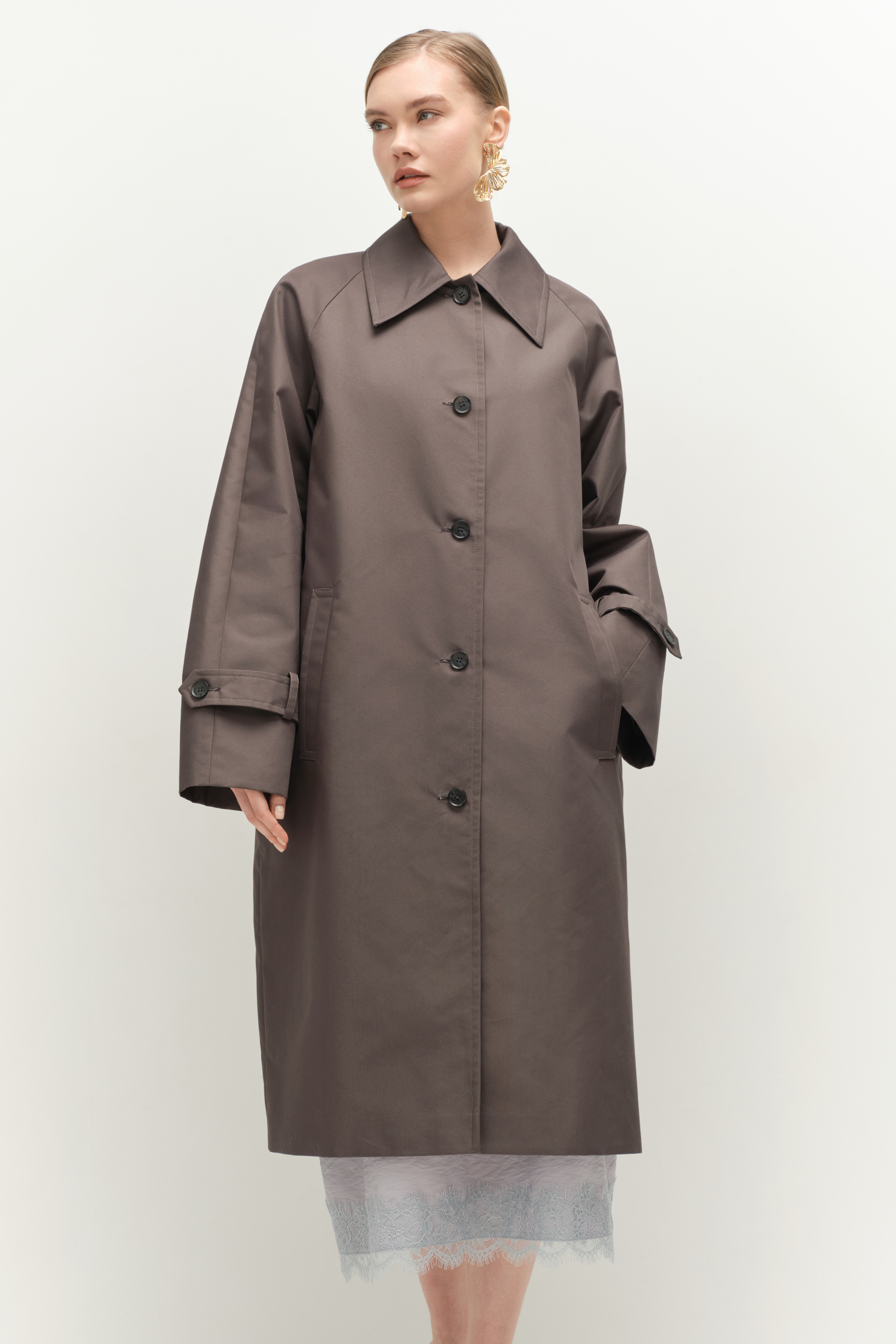 Однобортный тренч в длине миди в красивом графитовом оттенке. Свободный прямой крой, рукава реглан, увеличенный воротник и отсутствие пояса дарят изделию одновременно и современную форму и модный винтажный флер. Выполнен из пластичного смесового хлопка на подкладе из поливискозы. Застегивается на пуговицы, на рукавах паты. Рекомендуемый температурный режим от +10 градусов (зависит от личных ощущений).