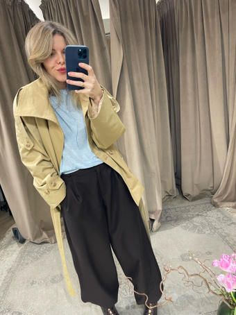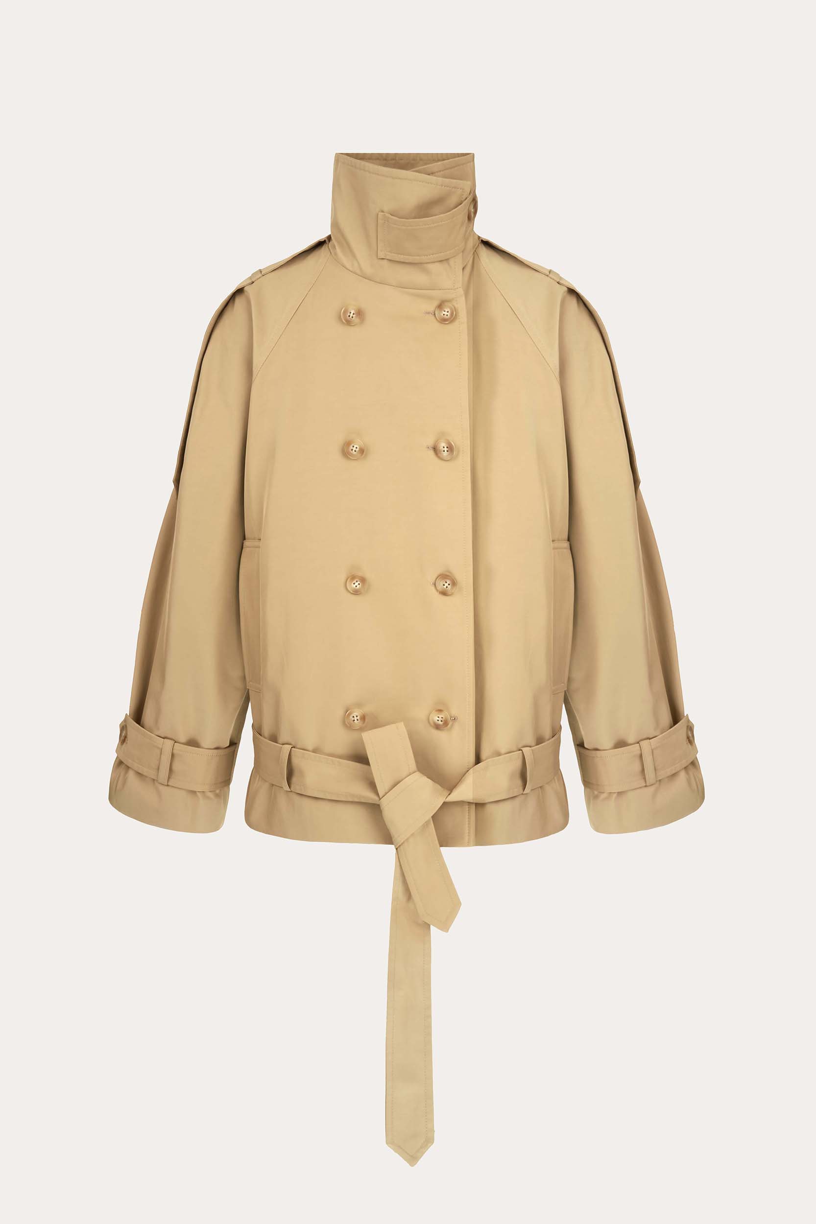 Укороченный тренч с высоким воротником-стойкой выполнен из смесового хлопка и подкладом из поливискозы. Регулируемый низ с поясом из той же ткани позволяет корректировать силуэт по желанию. Двубортная застежка на пуговицы в цвет ткани придает образу элегантность и лаконичность. Рекомендуемый температурный режим от +10 градусов (зависит от личных ощущений).