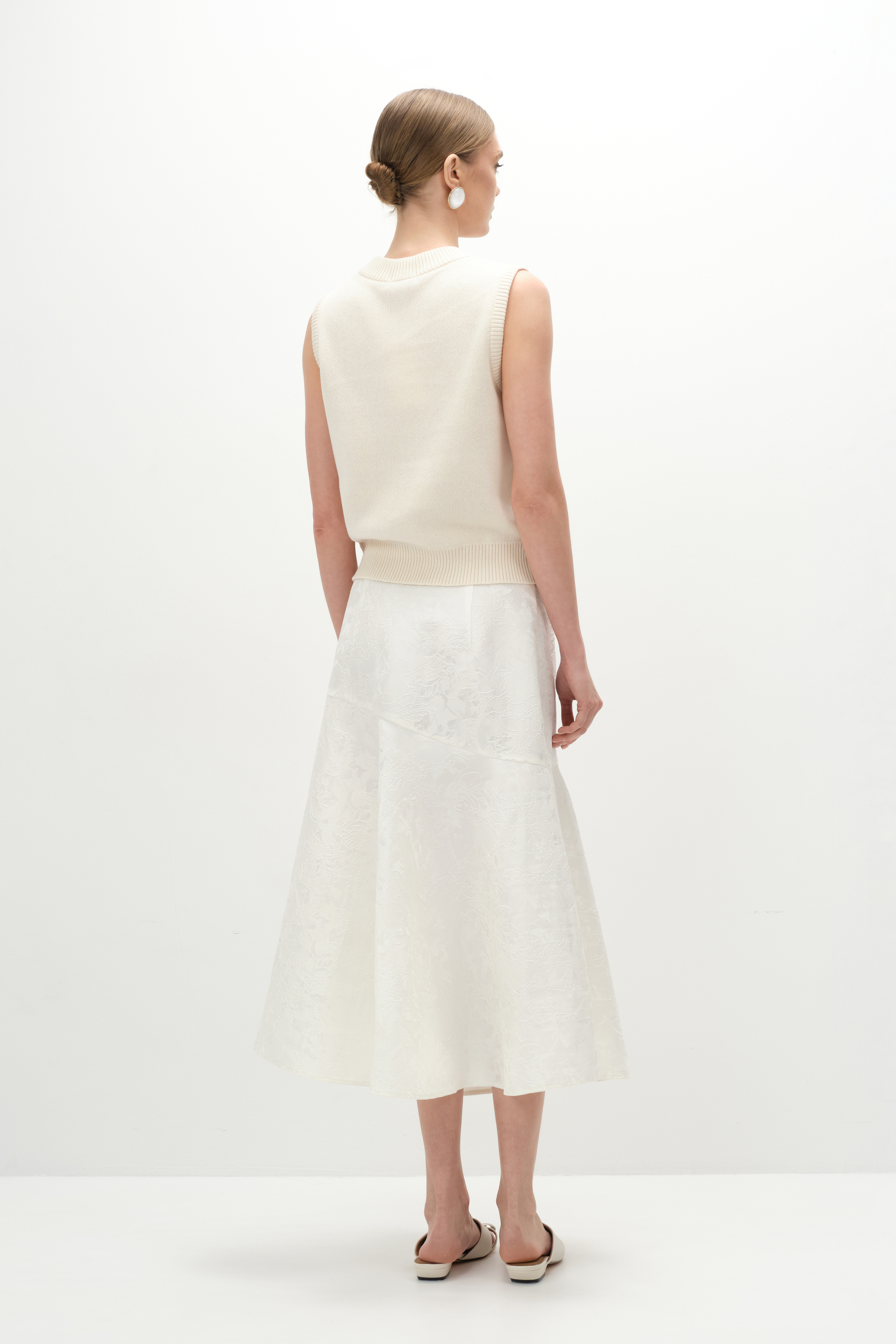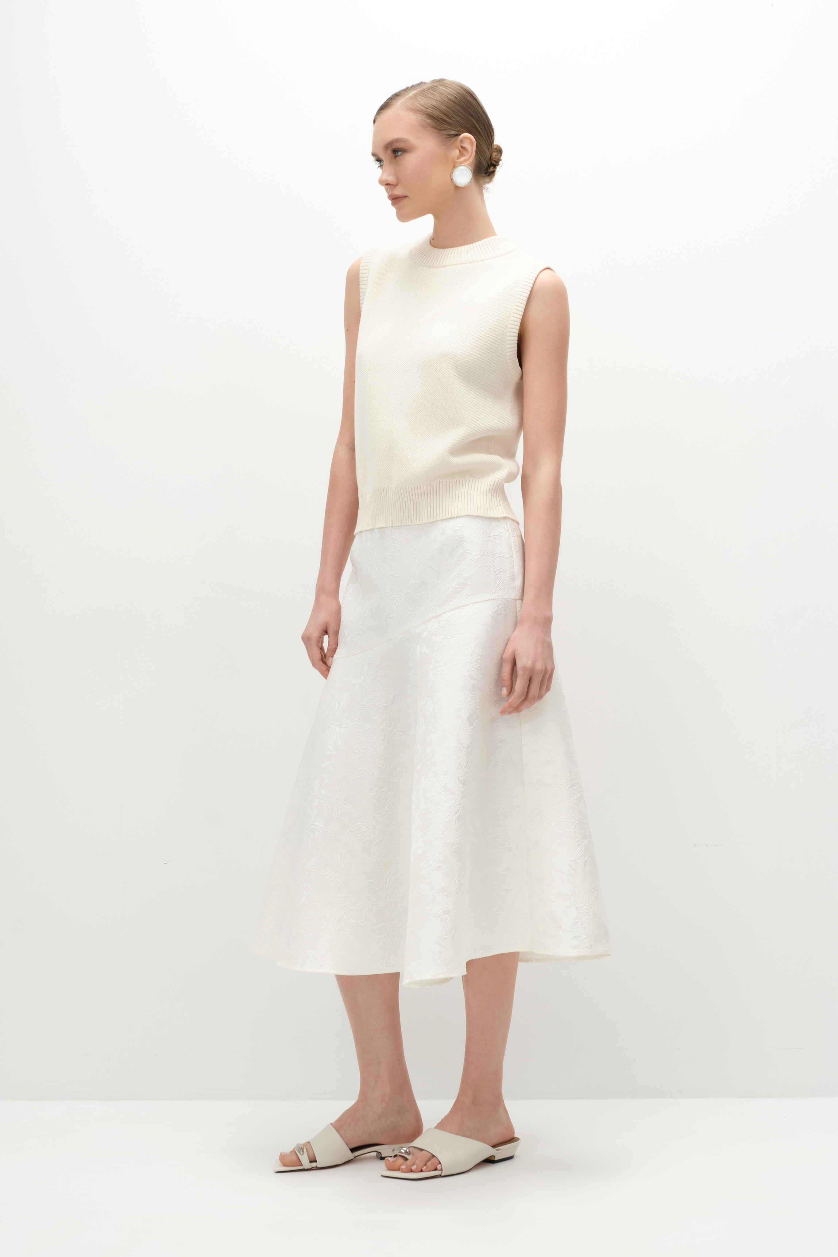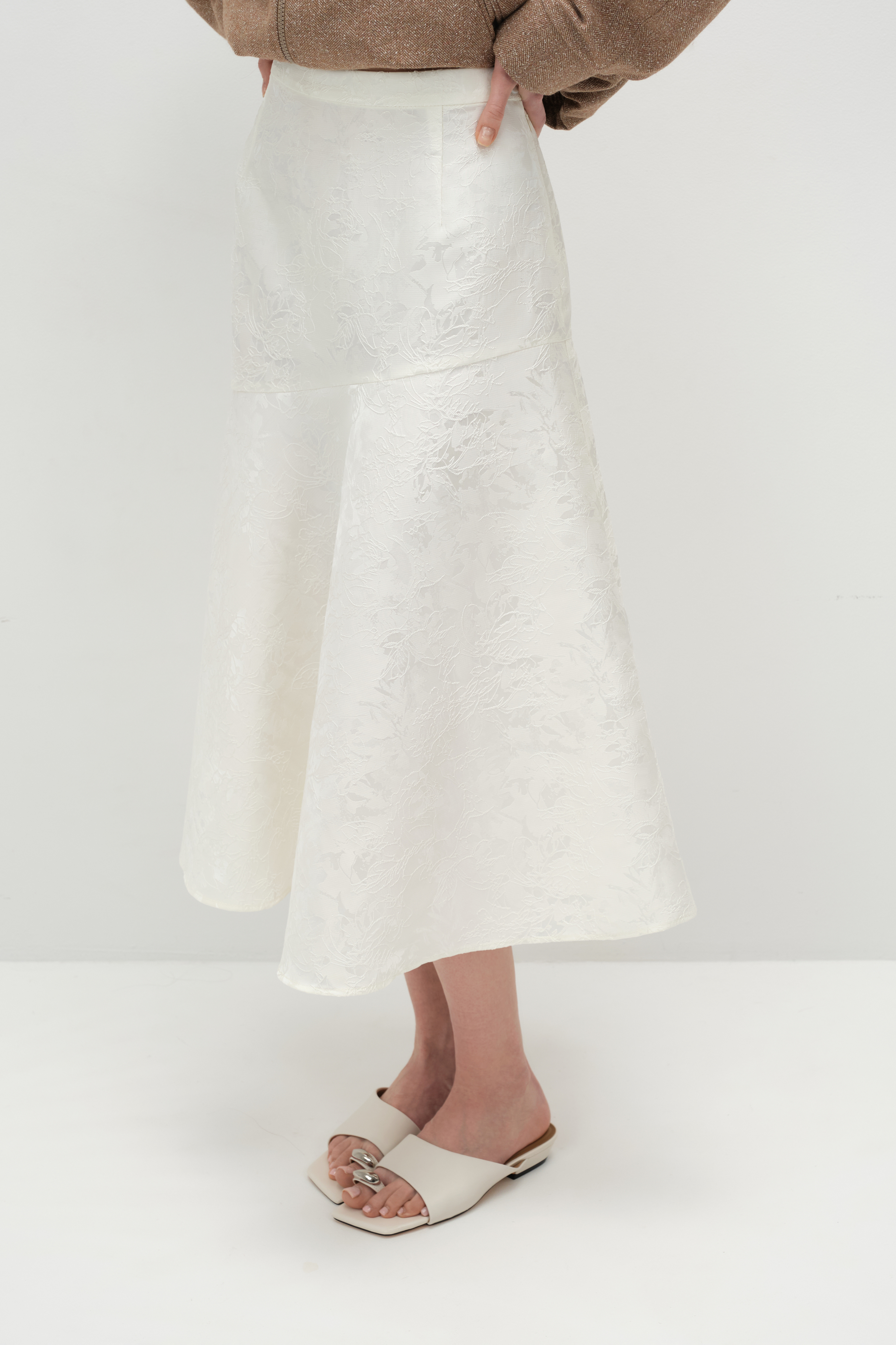 Юбка на кокетке из молочного жаккарда, выполненная из приятного на ощупь фактурного полиэстера. Застёгивается на боковую молнию и пуговицу. Правильная форма и высота кокетки делают юбку подходящей для любого типа фигуры. Её выразительный принт разнообразит гардероб и отлично сочетается как с базовыми, так и с яркими плечевыми изделиями.