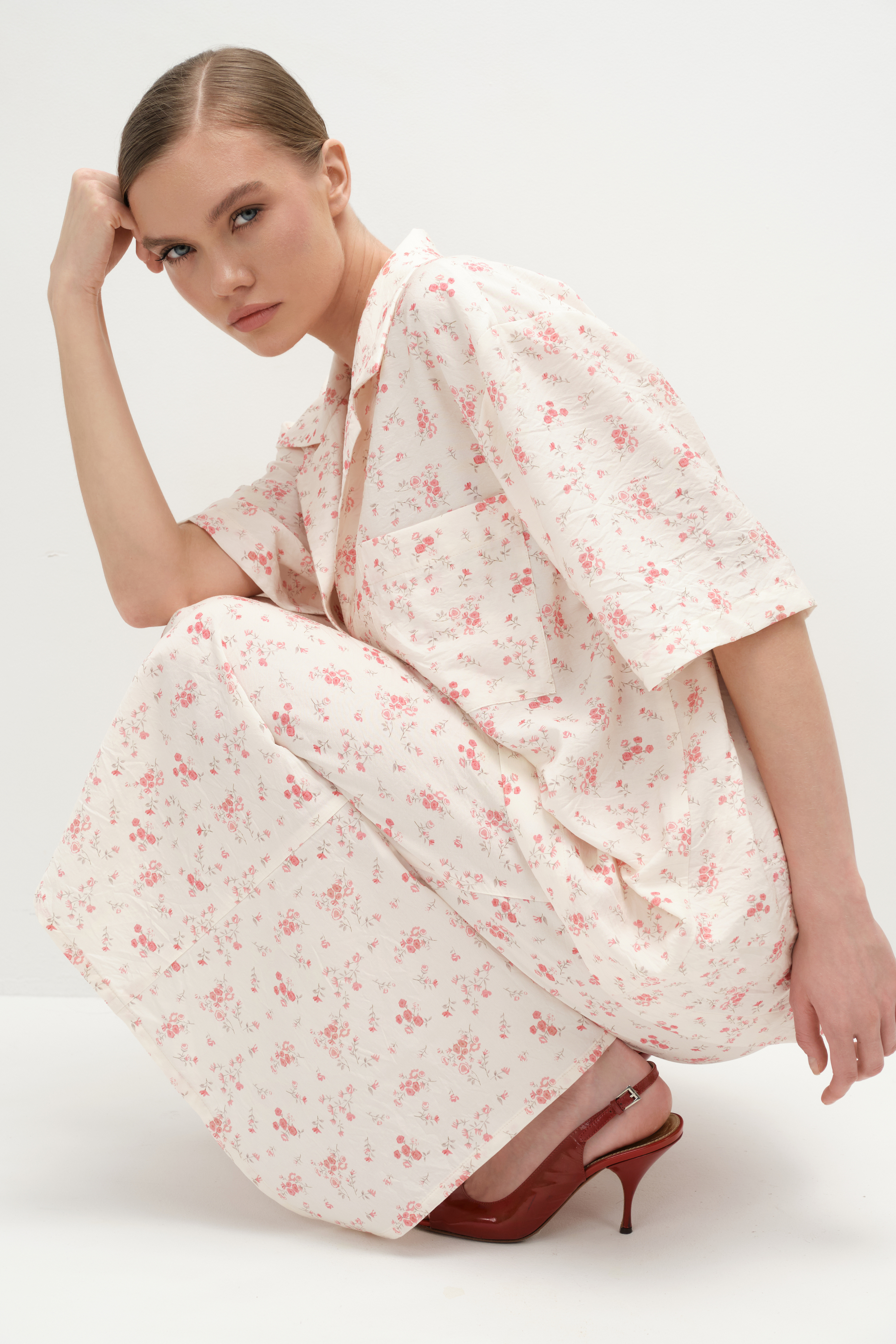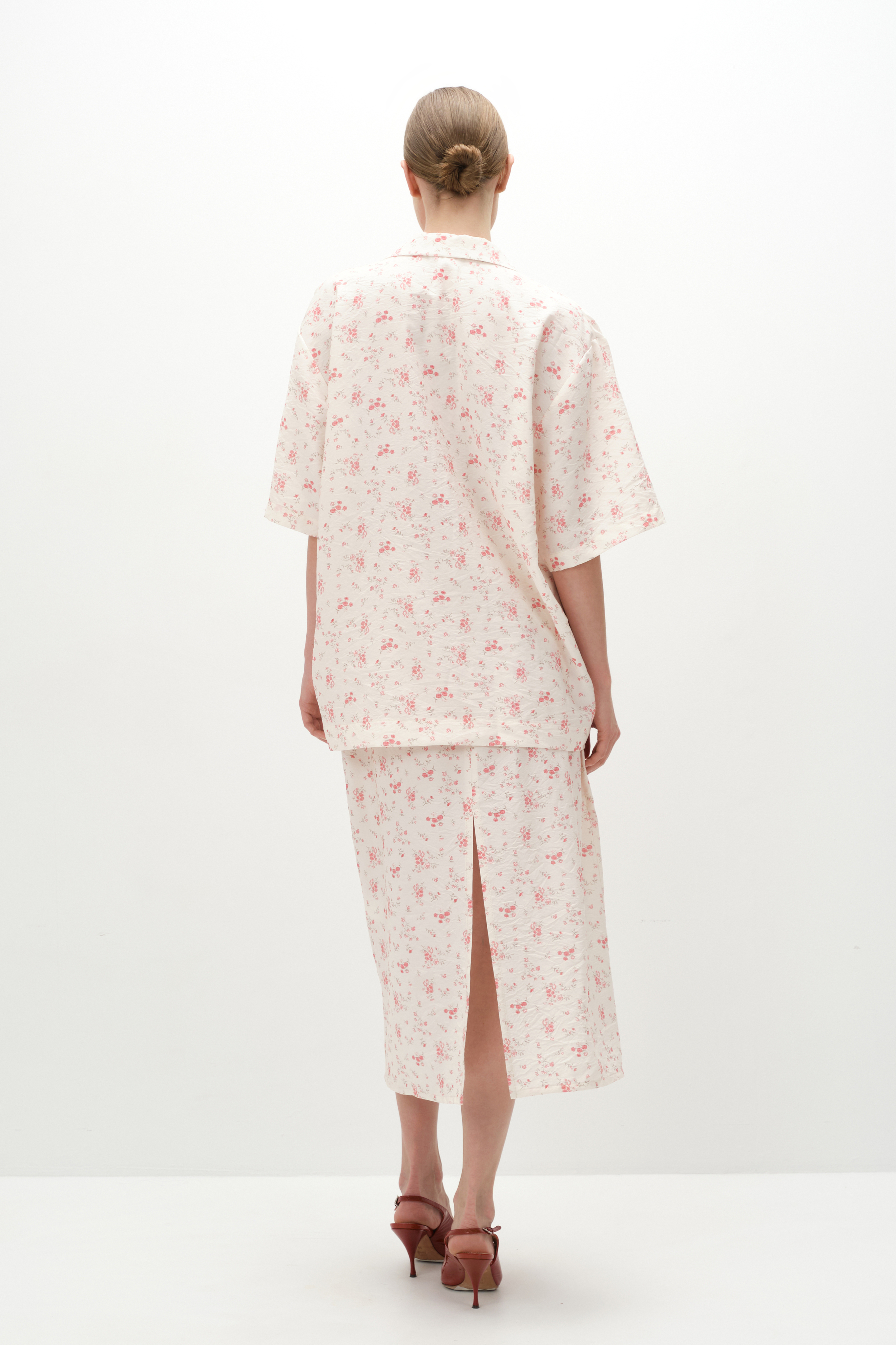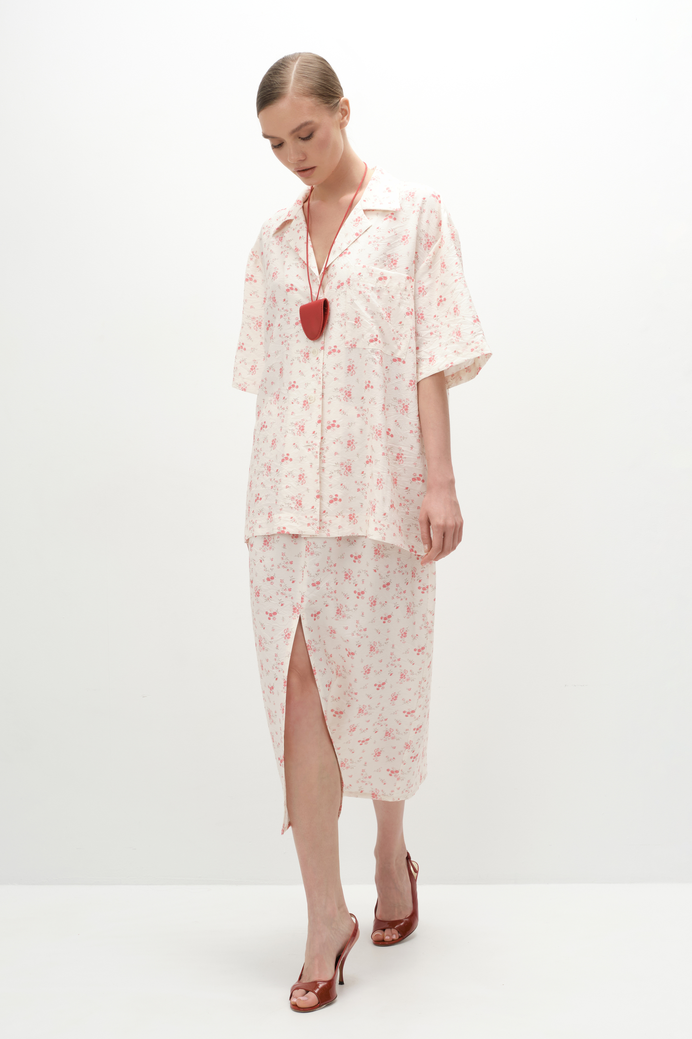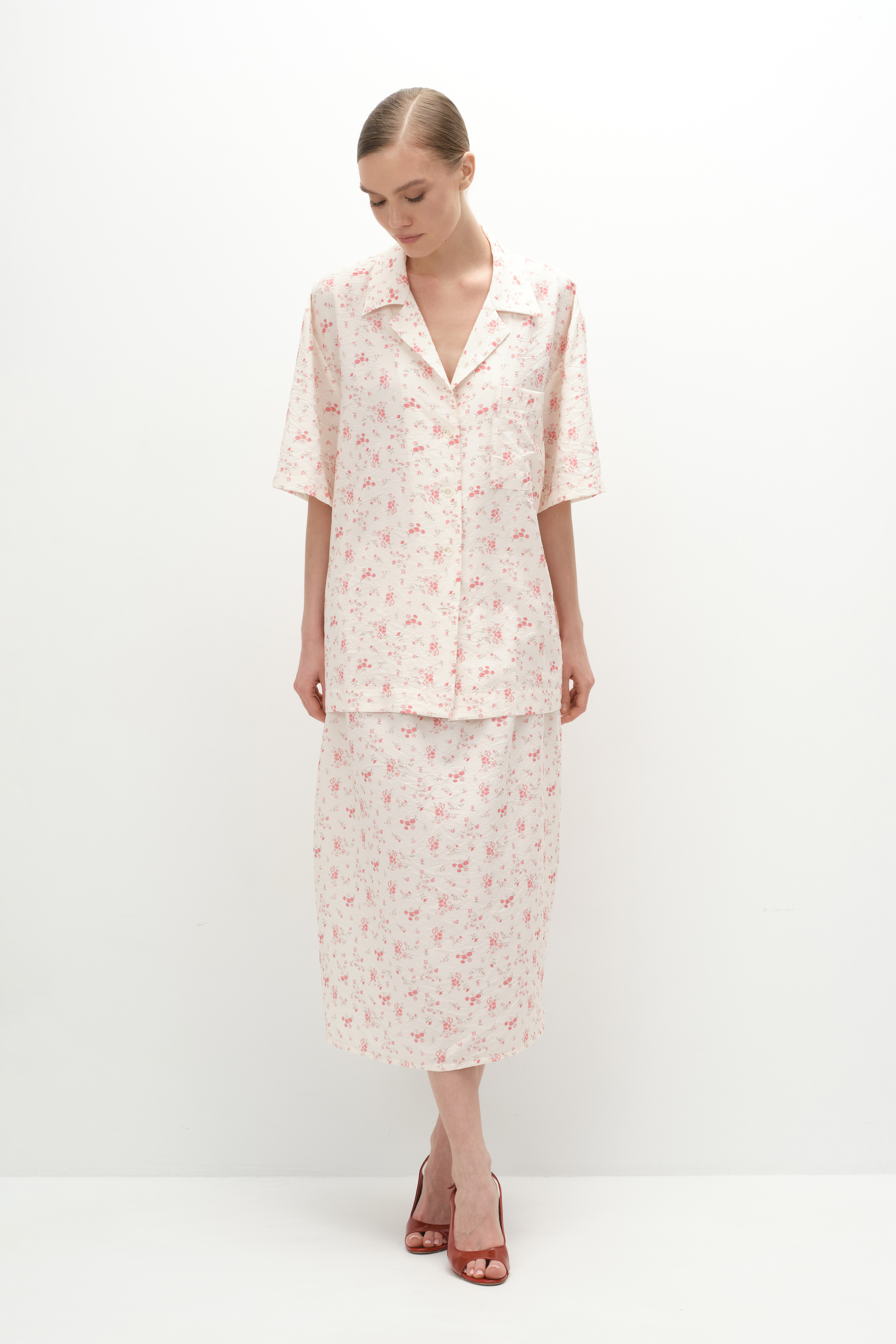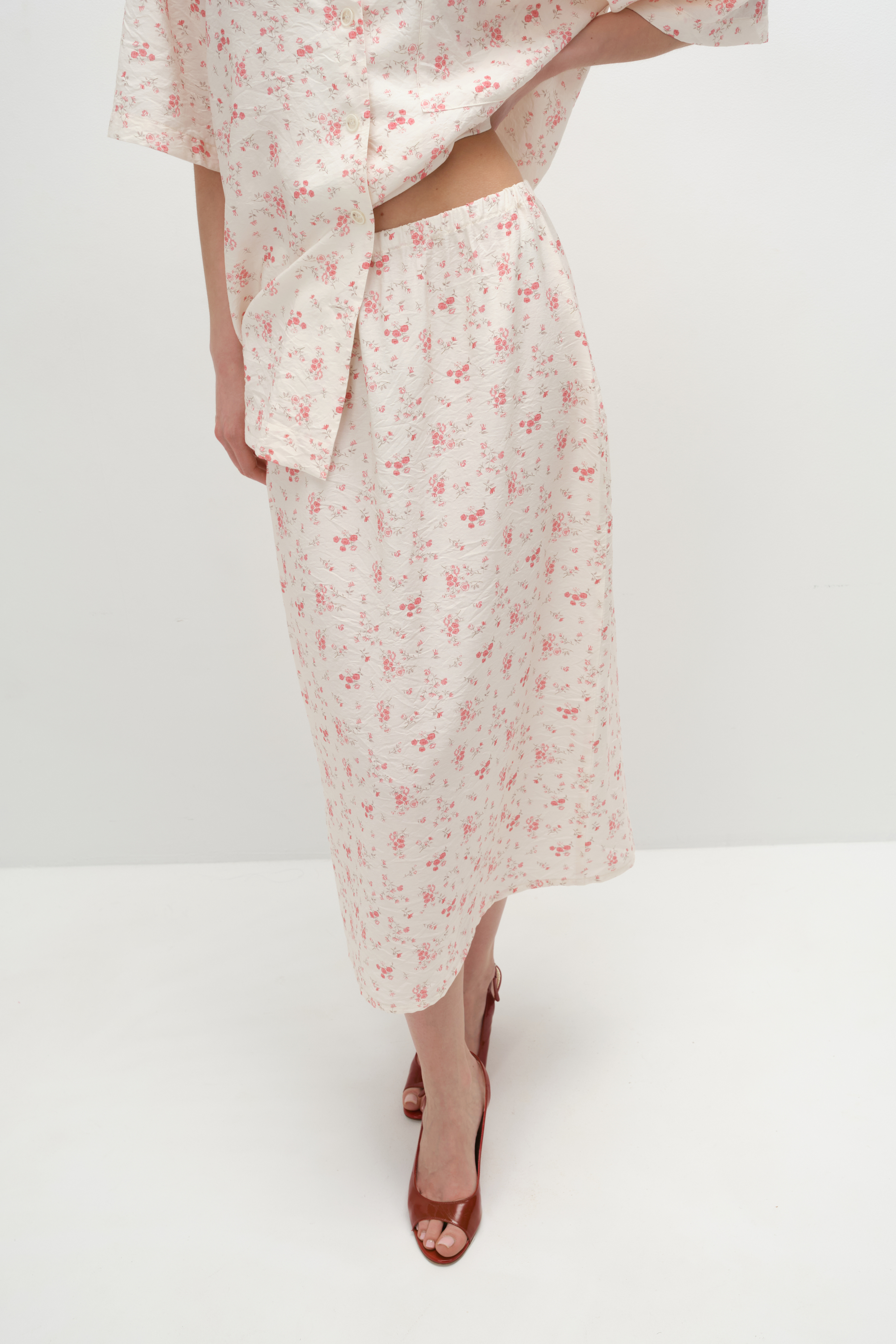 Расслабленная романтичная юбка на резинке в пижамном стиле с цветочным принтом. Изделие свободного кроя выполнено из матовой фактурной вискозы, со шлицей сзади, которую можно носить вперёд, что позволяет создавать разные образы. В пару к юбке идёт блуза из такой же ткани. Получится идеальный сет как для неспешного загородного отдыха, так и для вечерних выходов, а также он удобен для путешествий, так как занимает очень мало места в чемодане.