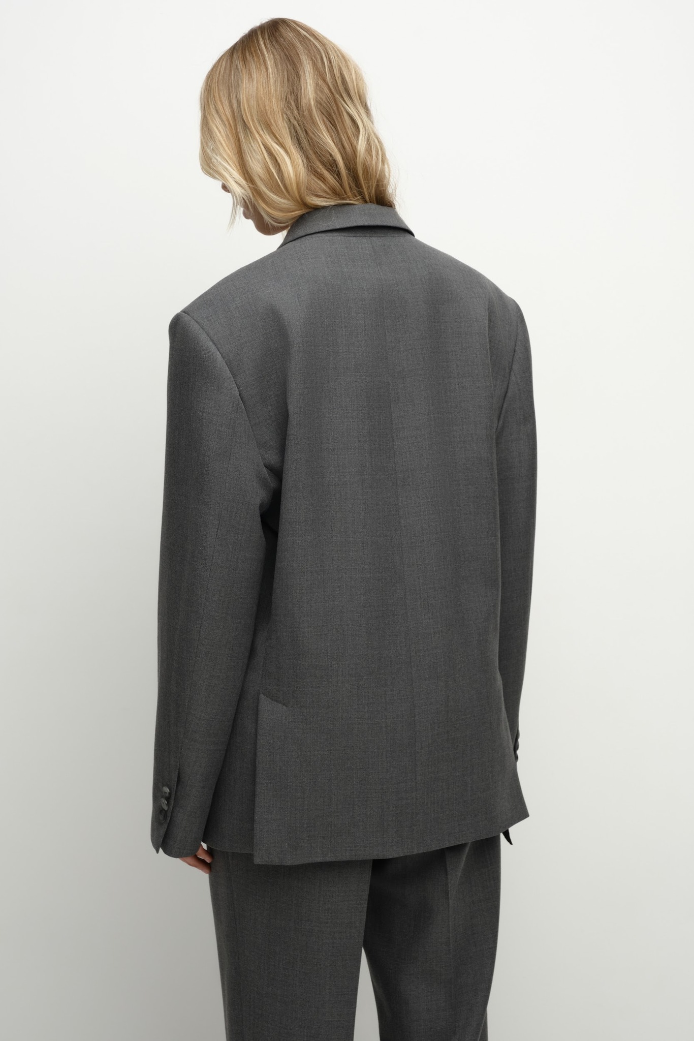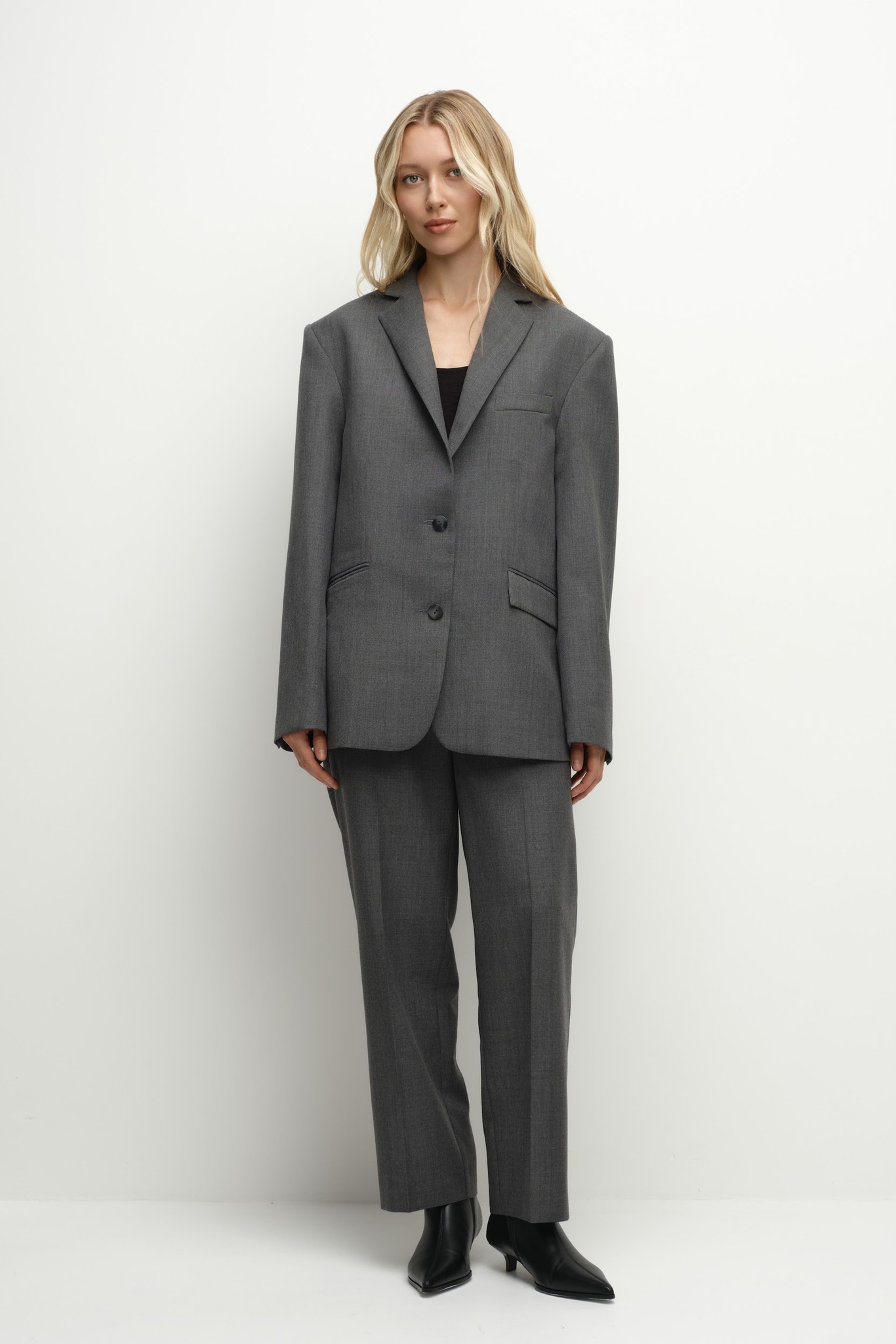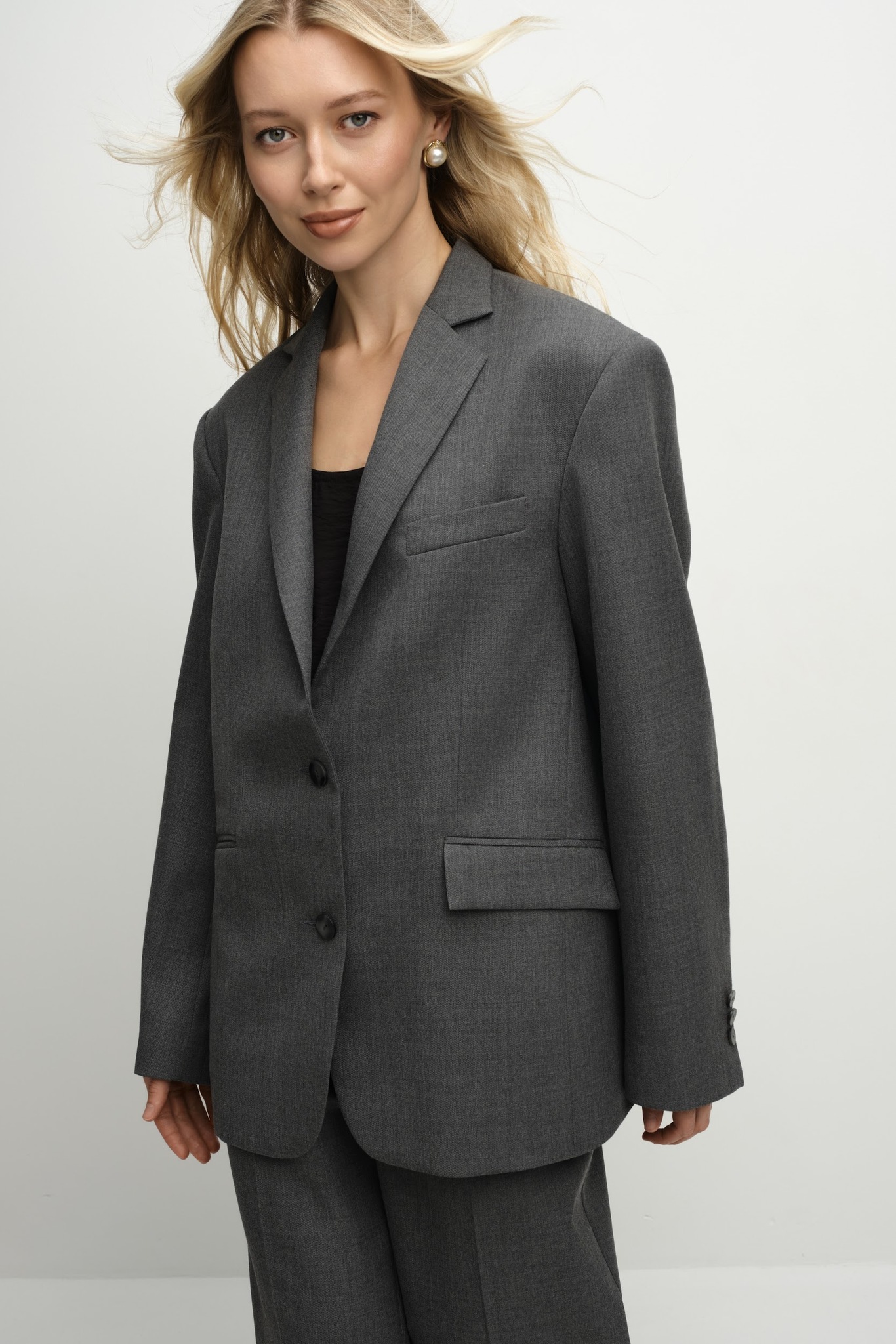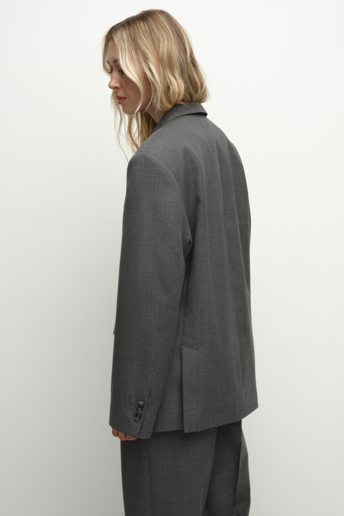 Мы вдохновились находкой нашего арт-директора Марины - винтажным мужским пиджаком. Внесли в его конструкцию необходимые нам корректировки для идеальной посадки, так получился Маринин жакет. Аккуратный по объему, немного приталенный, однобортный, с двумя шлицами по спинке изделия. В этом сезоне выбрали для него однотонную полушерсть в тёмно-сером цвете. Всем любителям ретро-эстетики в современном исполнении - обязателен к примерке. В пару можно выбрать прямые укороченные брюки или брюки на резинке из такой же ткани.