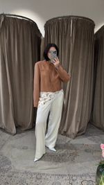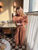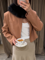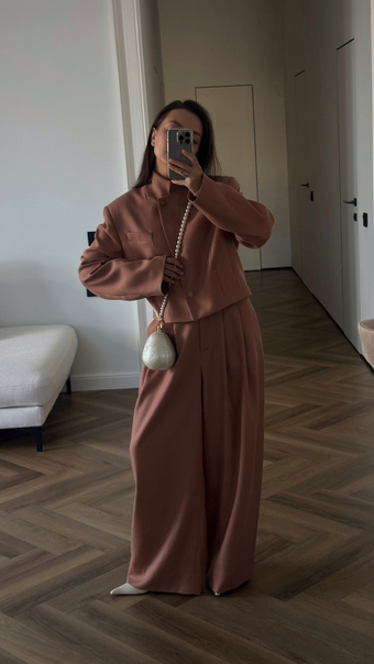 Объемный укороченный жакет с выразительными объемными плечами выполнен из смесовой полушерсти. Изделие выполнено с подкладом из поливискозы, застегивается на винтажные пуговицы — одна у воротника, другая внизу, что добавляет образу особый шарм. В пару к жакету отлично подойдут брюки из такой же ткани для завершенного образа.
