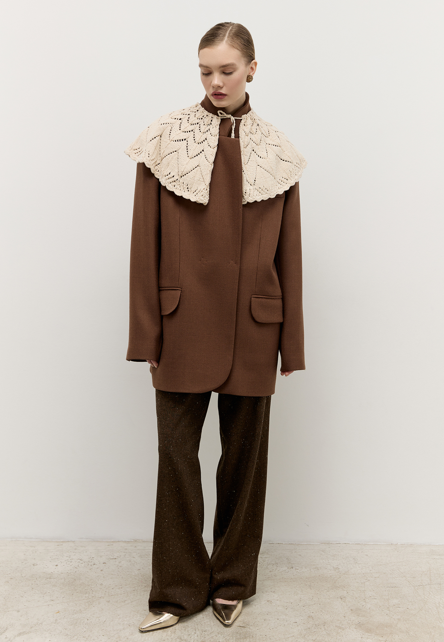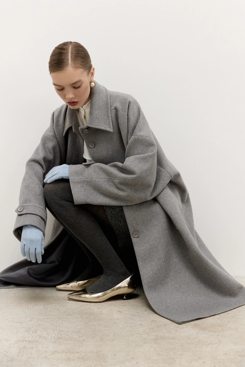Пальто в форме жакета из шерсти. Умеренный объем, увеличенная линия плеча, классический английский воротник, длина до середины бедра и скрытая фурнитура - безупречная лаконичная формула для весенних образов. Выполнено на подкладе из поливискозы, застегивается на потайные кнопки в цвет изделия.