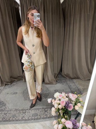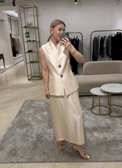 Элегантный жилет из поливискозы с яркими металлическими пуговицами подчеркнет ваш индивидуальный стиль и добавит образу особый шарм. В сочетании с прямыми укороченными брюками или классической юбкой-карандаш из той же ткани он создает универсальный комплект, идеально подходящий как для деловых встреч, так и для вечерних выходов.